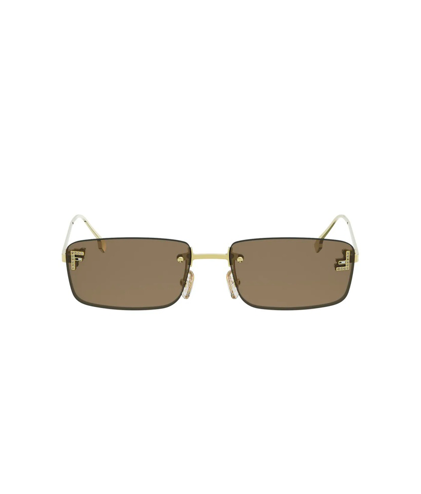 Montatura in metallo oro lucido, forma quadrata “rimless”, lenti marroni. Un modello elegante della linea Fendi First Crystal, perfetto per un look raffinato e femminile.