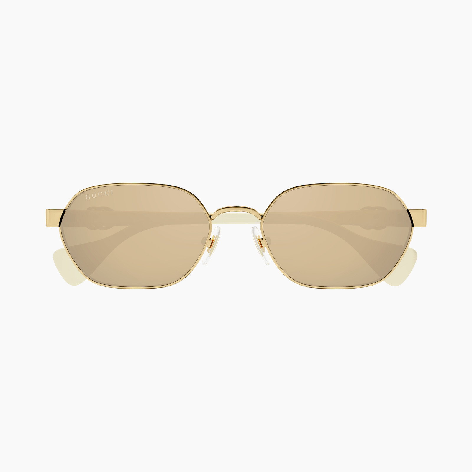 Montatura in metallo oro lucido con aste avorio e lenti color nudo. Forma pantos, misura 56-18-140: un modello sofisticato e di carattere firmato Gucci.