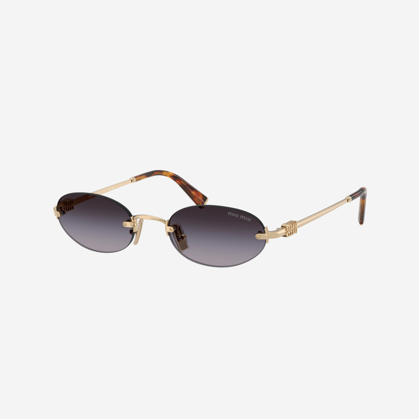 Montatura in metallo oro pallido, forma ovale moderna e lenti grigio sfumato. Un accessorio femminile raffinato, perfetto per chi ama un tocco di eleganza discreta firmata Miu Miu.