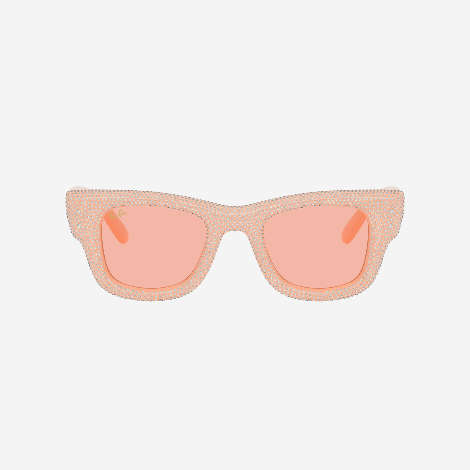 Un’interpretazione audace e contemporanea del classico Wayfarer. Il modello presenta una montatura quadrata in nylon rosa completamente rivestita in strass pavé, con un effetto visivamente deciso e brillante. Le lenti in bio-poliammide rosa scuri offrono chiarezza visiva e protezione anti-UV.