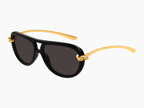 Gli occhiali da sole Bottega Veneta BV1418S-001 reinterpretano la classica forma aviatore con un’eleganza dal gusto vintage. La montatura in metallo nero presenta bordi smussati impreziositi da un nodo decorativo su ciascun musetto, richiamo all’iconico design del brand. I terminali organici con logo inciso al laser completano un modello raffinato e distintivo, perfetto per chi ama dettagli ricercati e stile senza tempo.