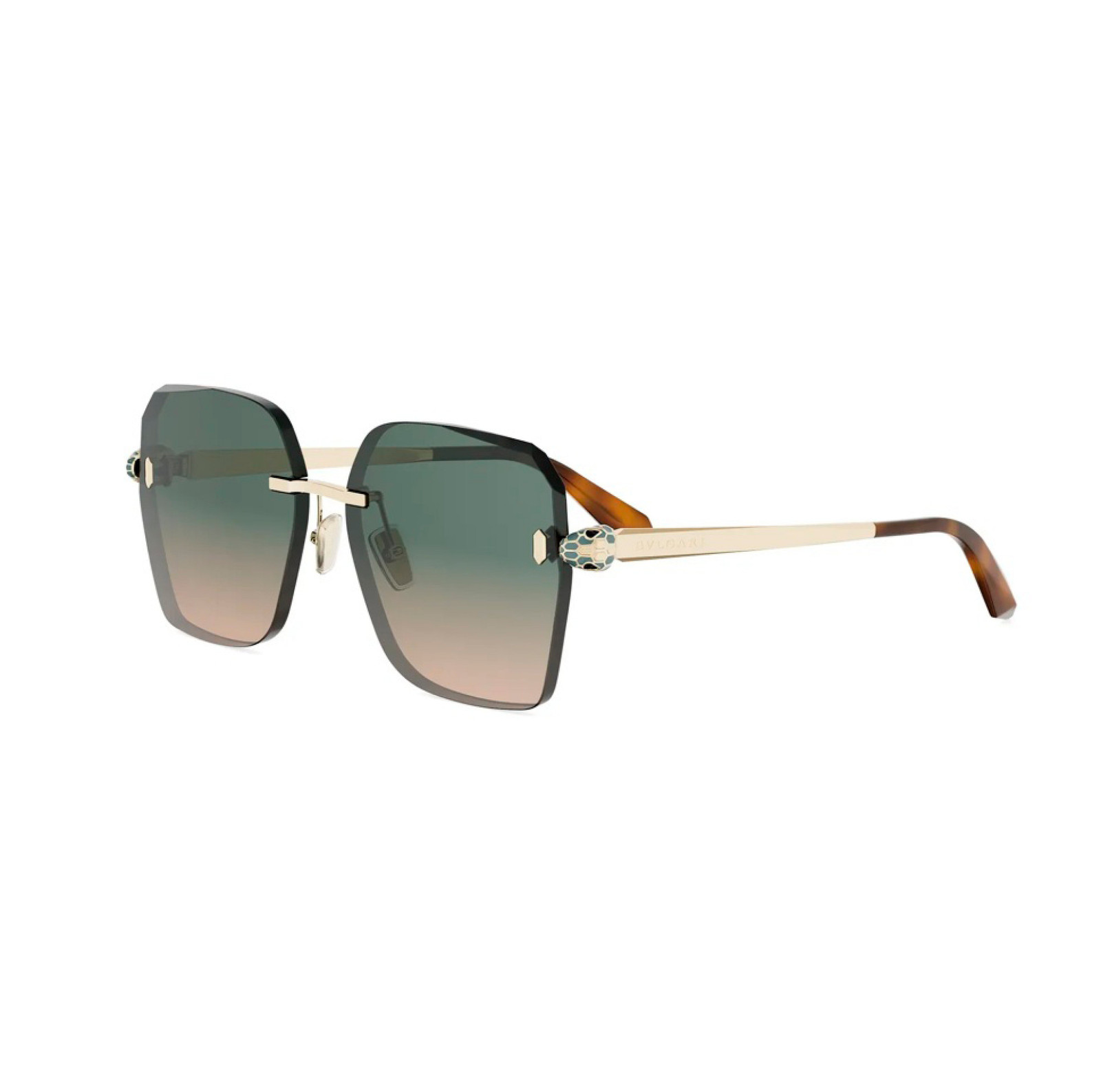 Montatura in metallo oro lucido, forma squadrata oversize, lenti sfumate verde. Un modello elegante della linea Serpenti Forever, perfetto per uno stile femminile distintivo e raffinato.