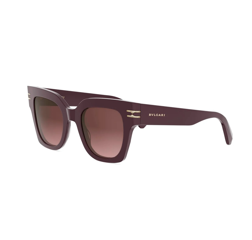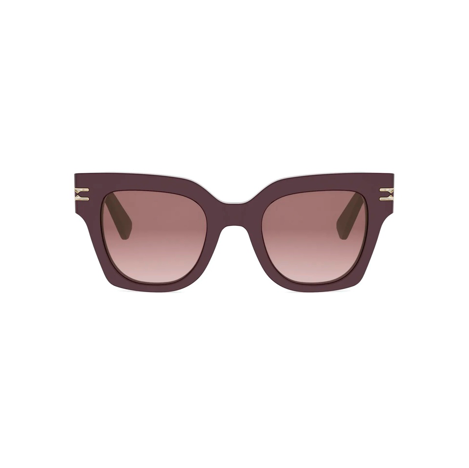 Montatura in acetato viola lucido con lenti bordeaux sfumate, forma geometrica compatta