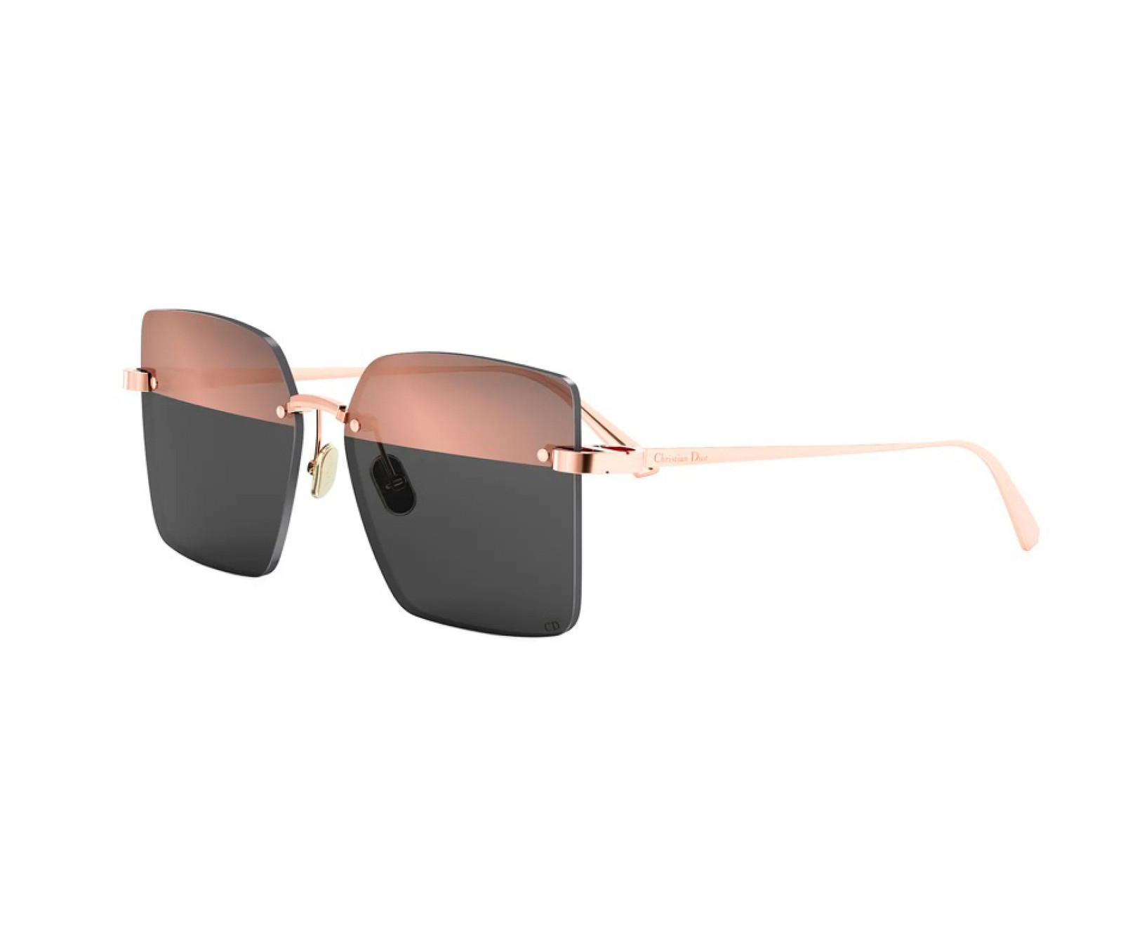 Montatura in metallo oro rosa dal design squadrato e rimless, con lenti grigio. Un accessorio femminile raffinato della linea CDior, ideale per uno stile elegante e contemporaneo.