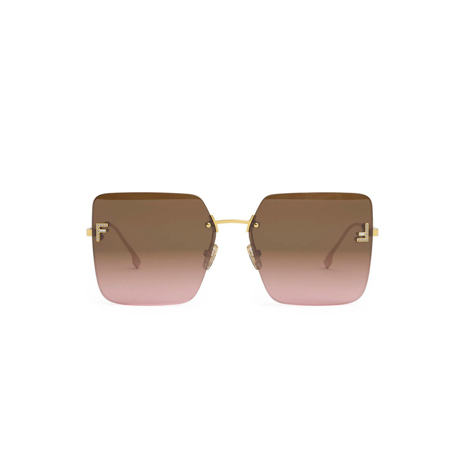 Montatura in metallo oro lucido senza contorno, forma squadrata oversize e lenti gradiente marroni. Un modello della collezione “Fendi First” dal design fresco e distintivo.