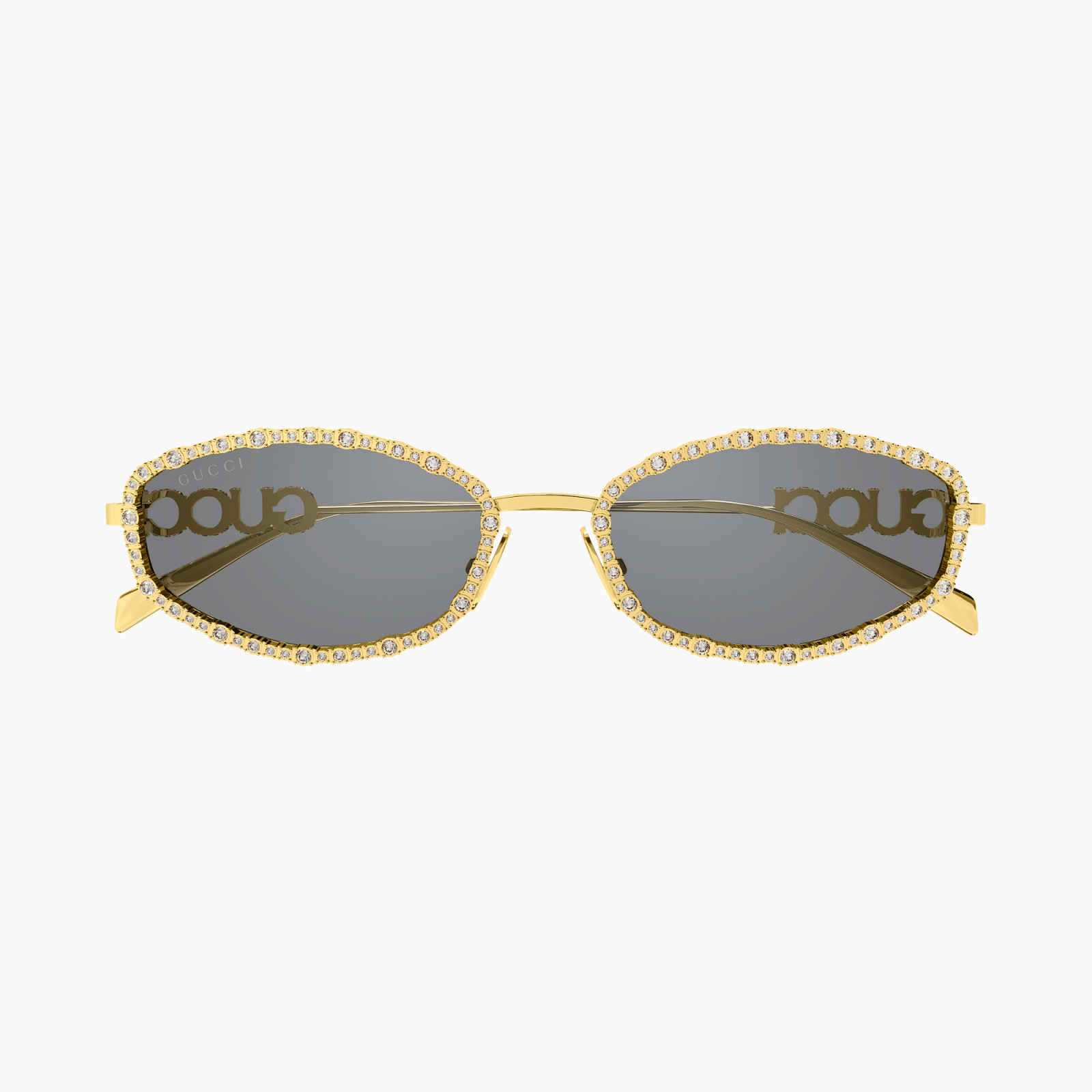 Modelli in metallo caratterizzati da strass di cristalli e la scritta Gucci tridimensionale che va ad arricchire l’asta. Forma a mandorla stretta. SKU esclusive con strass per i Fashion Pioneers.