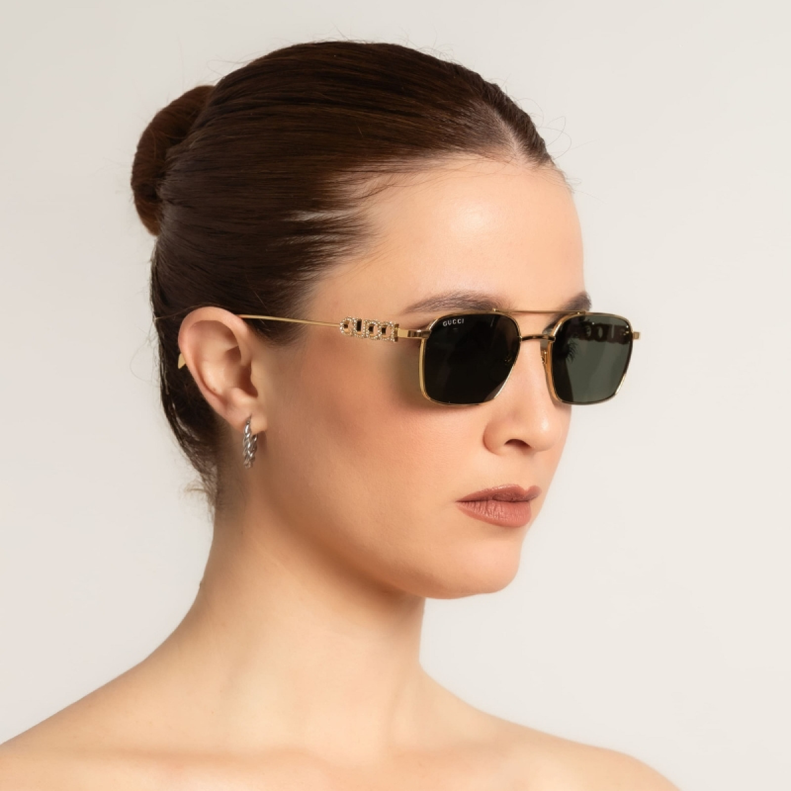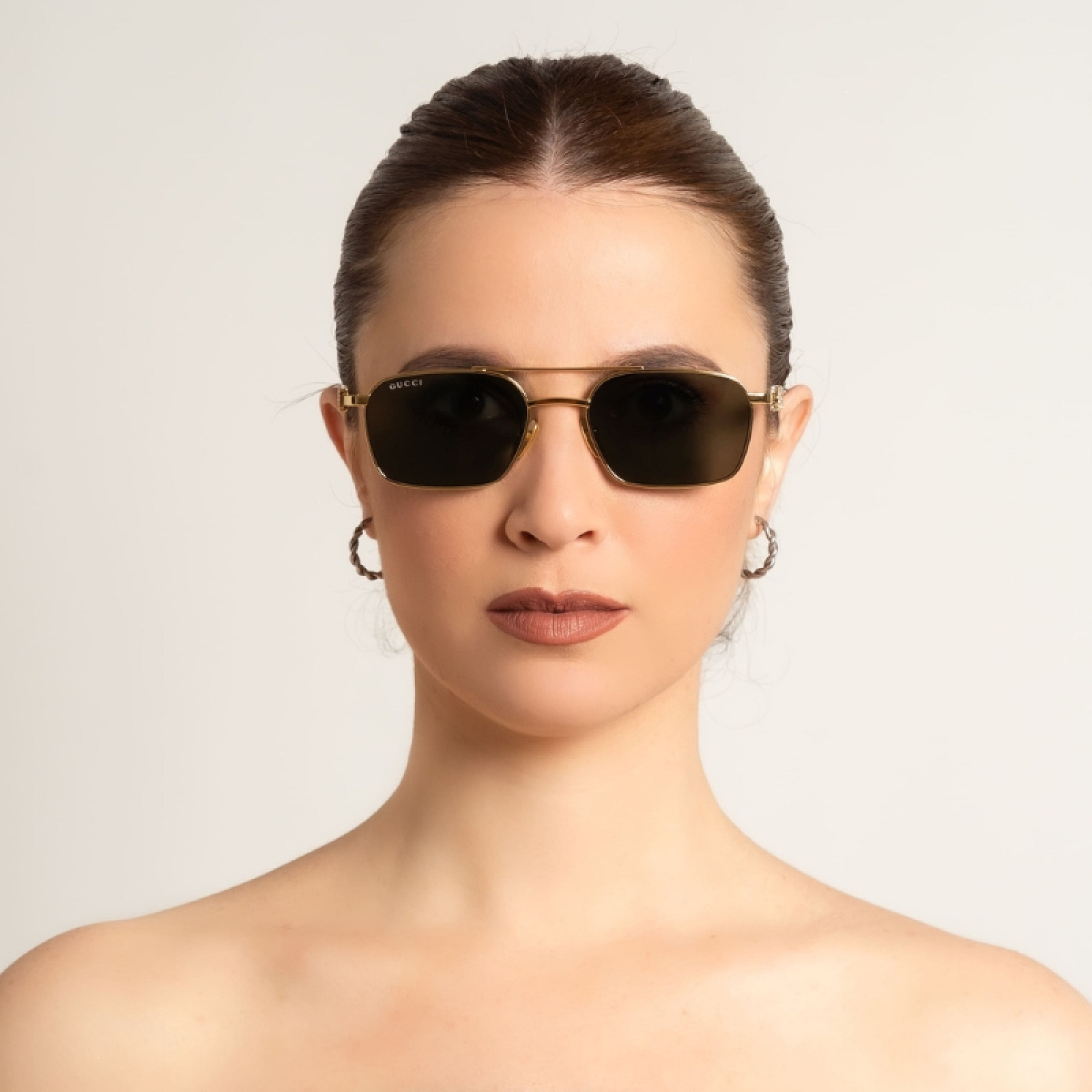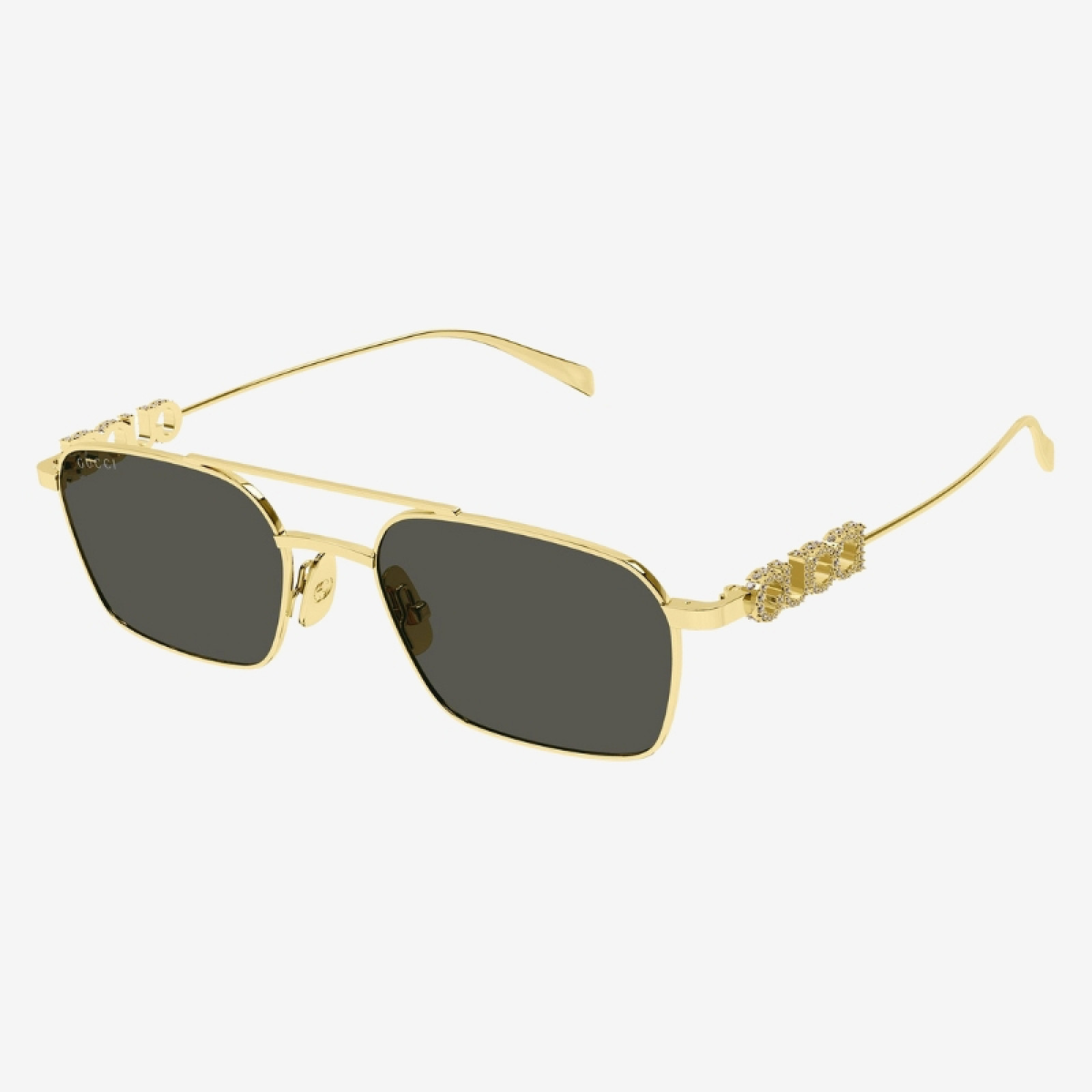 Stili in metallo caratterizzati dal logo tridimensionale arricchente con scritta Gucci sull’astina. Forma caravan con doppio ponte. Modelli cool e trendy con lenti sia opache che Guccissima.