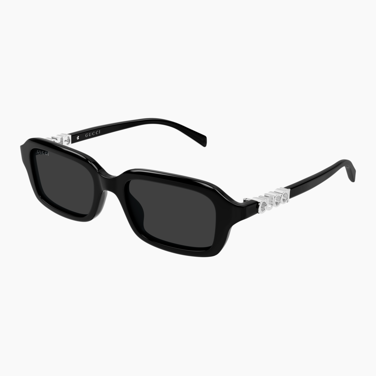 Montatura leggera in acetato con logo tridimensionale su entrambe le aste. Forma squadrata stretta commerciale. Varie opzioni di havana e logo in strass.