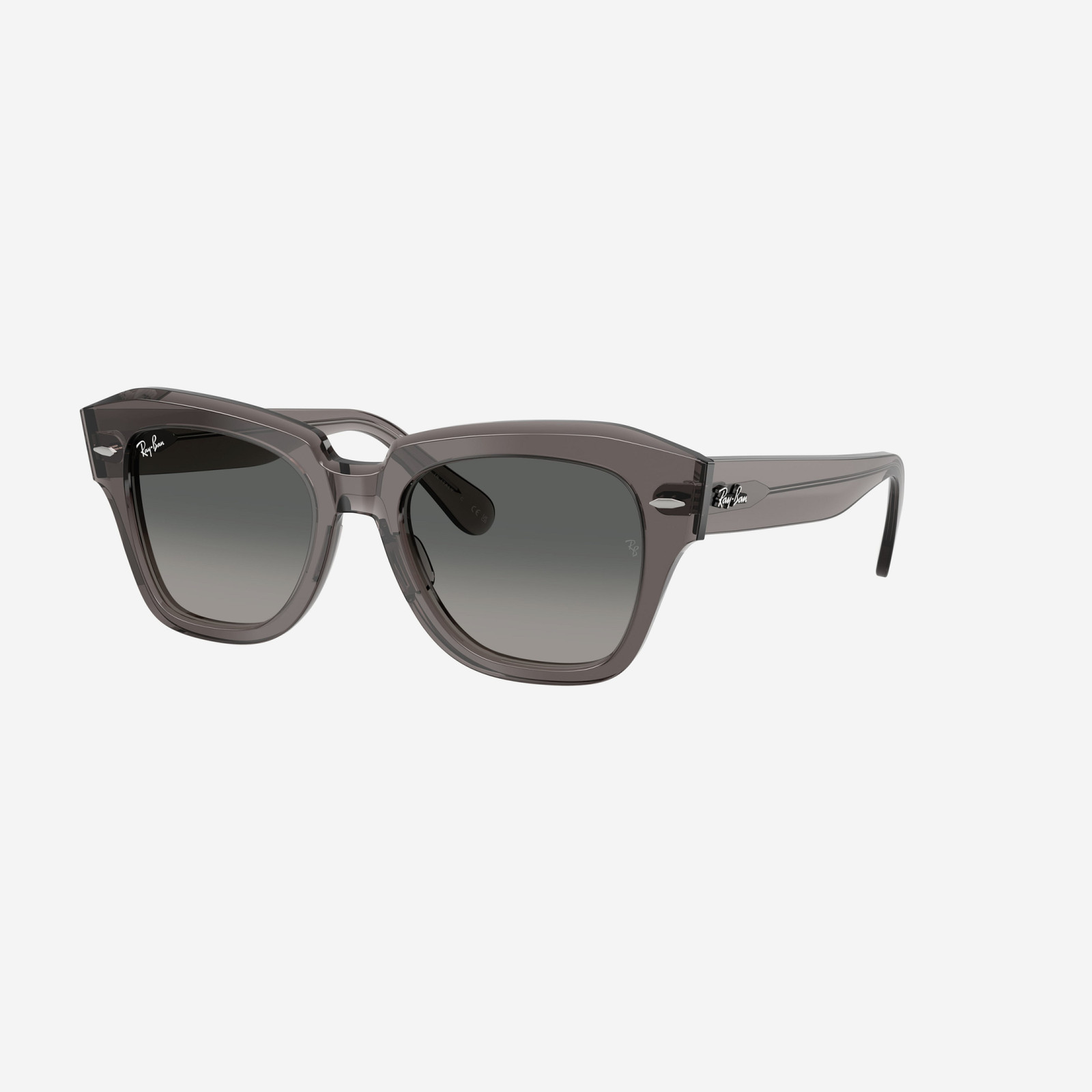 Occhiali da sole Ray-Ban RB2186 136971 – State Street con montatura grigio trasparente in acetato e lenti grigio sfumato. Questo modello unisex presenta una forma quadrata moderna e leggera, perfetta per completare outfit casual o fashion con comfort visivo e protezione UV400 totale dai raggi solari.