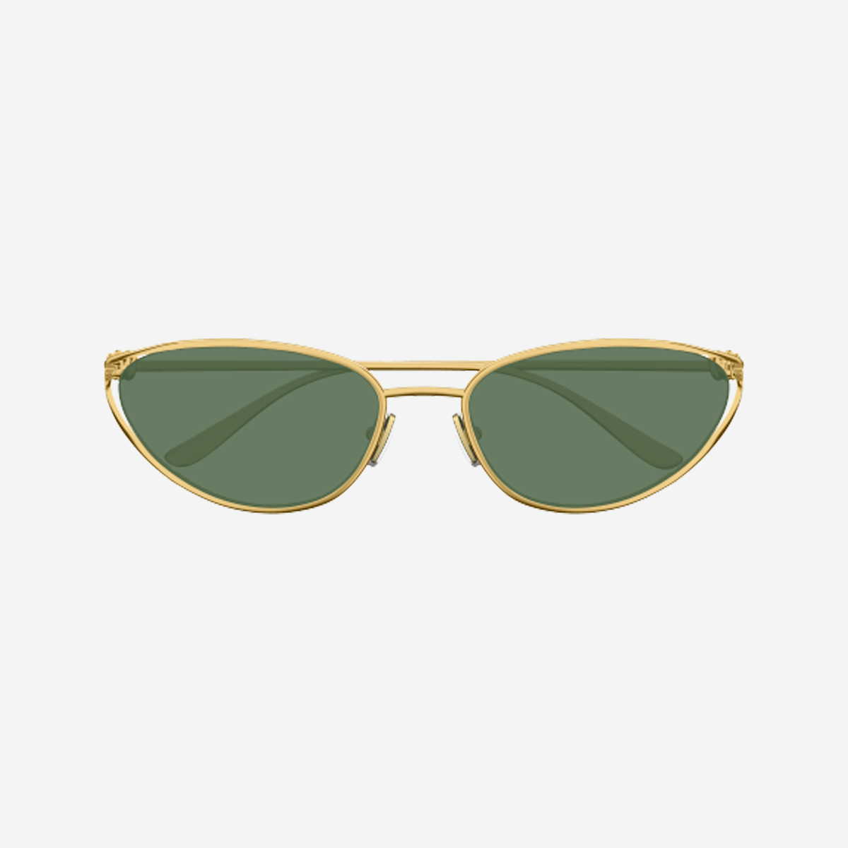 Gli occhiali da sole Bottega Veneta BV1330S-004 della linea Knot reinterpretano la forma cat-eye con eleganza e fluidità. La montatura in metallo dorato si distingue per la struttura a forchetta ispirata al doppio nodo iconico del brand, che dona leggerezza e raffinatezza. Le aste sottili, con piega centrale e logo Bottega Veneta inciso al laser sul terminale, completano un design sofisticato e femminile.