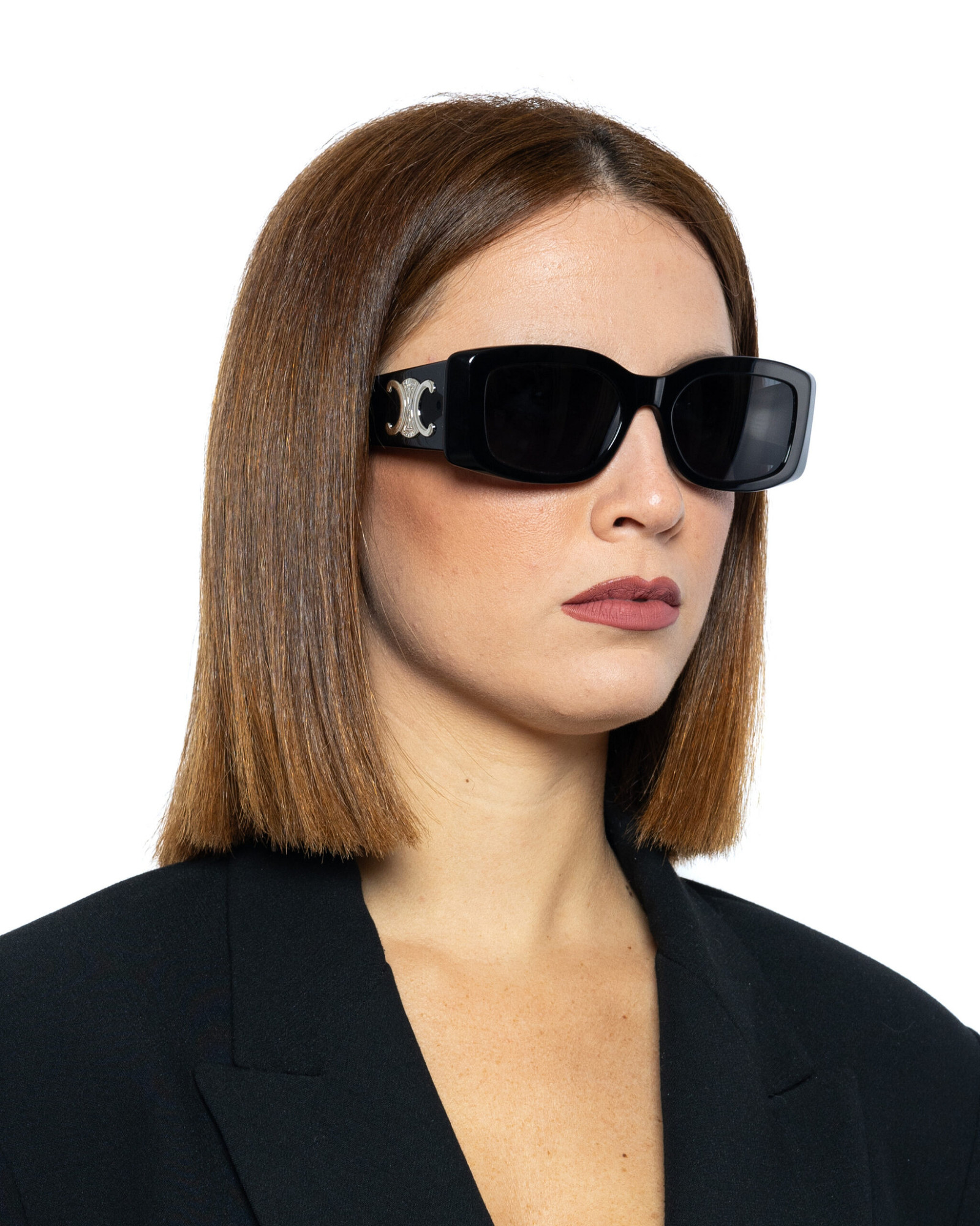 Gli occhiali da sole CELINE CL40282U-01A presentano una montatura in acetato nero lucido con lenti grigie sfumate, offrendo una protezione UV al 100%. La forma rettangolare conferisce un aspetto moderno e sofisticato. Le dimensioni includono una larghezza delle lenti di 53 mm, un ponte di 18 mm e aste di 135 mm. Questi occhiali uniscono stile e funzionalità, completando qualsiasi look con eleganza.