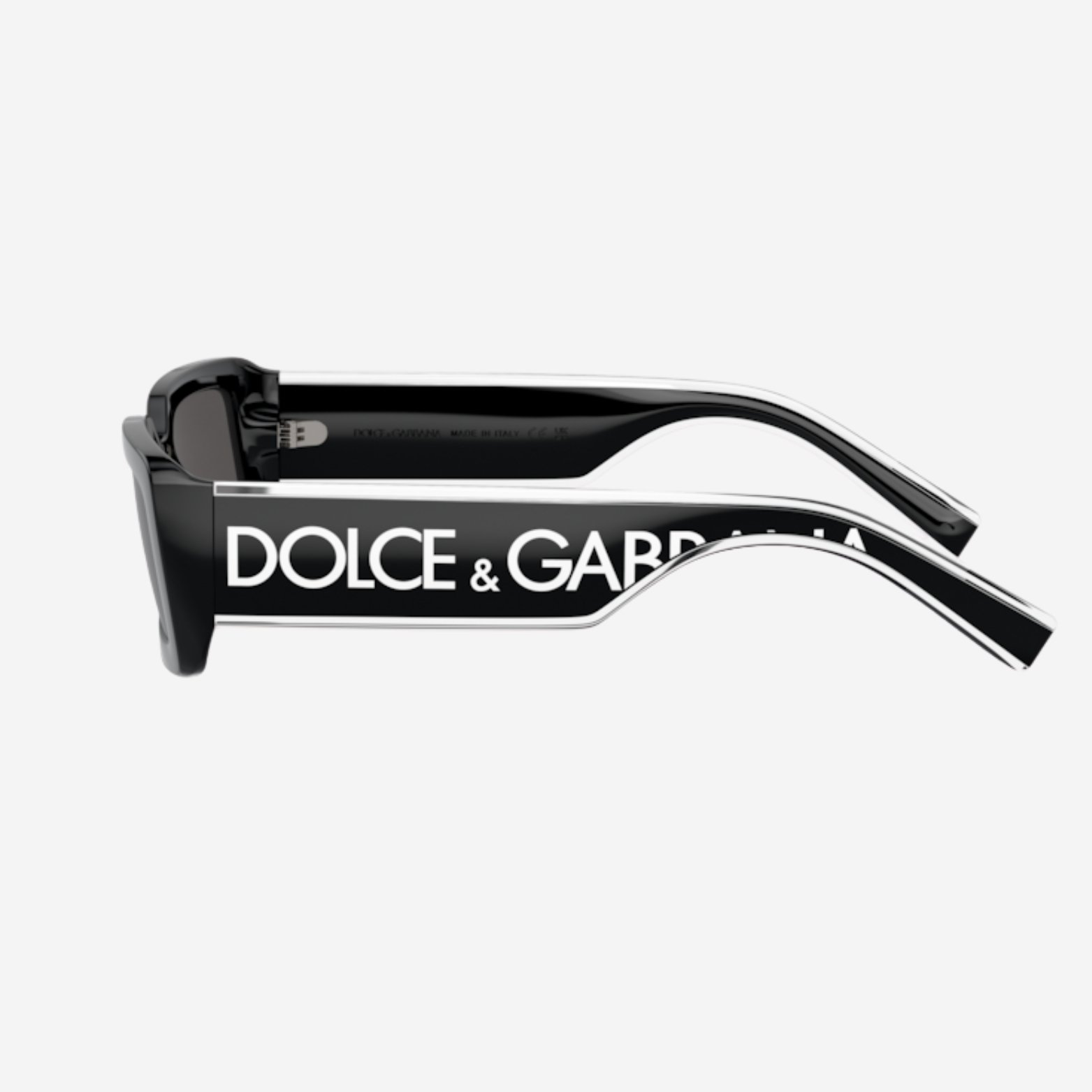 Occhiale da sole Dolce & Gabbana DG6187 501/87, montatura nera in nylon iniettato e lenti grigio scuro categoria 3 con filtro UV 400. Design rettangolare elegante, calibro 53 mm, ponte 20 mm e aste 145 mm. Alta qualità, stile sofisticato e perfetto per un look contemporaneo e distintivo.