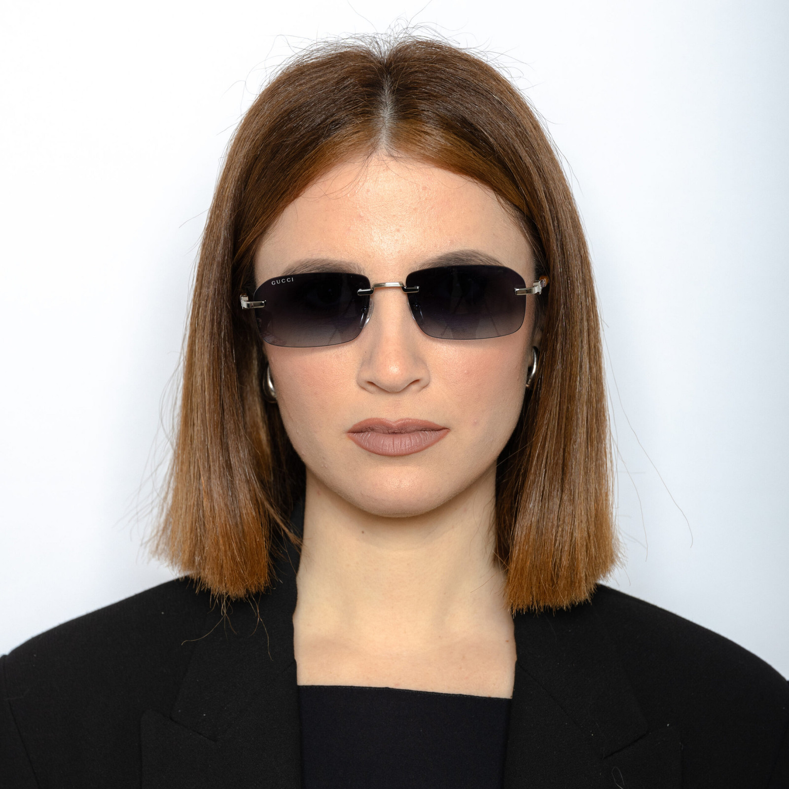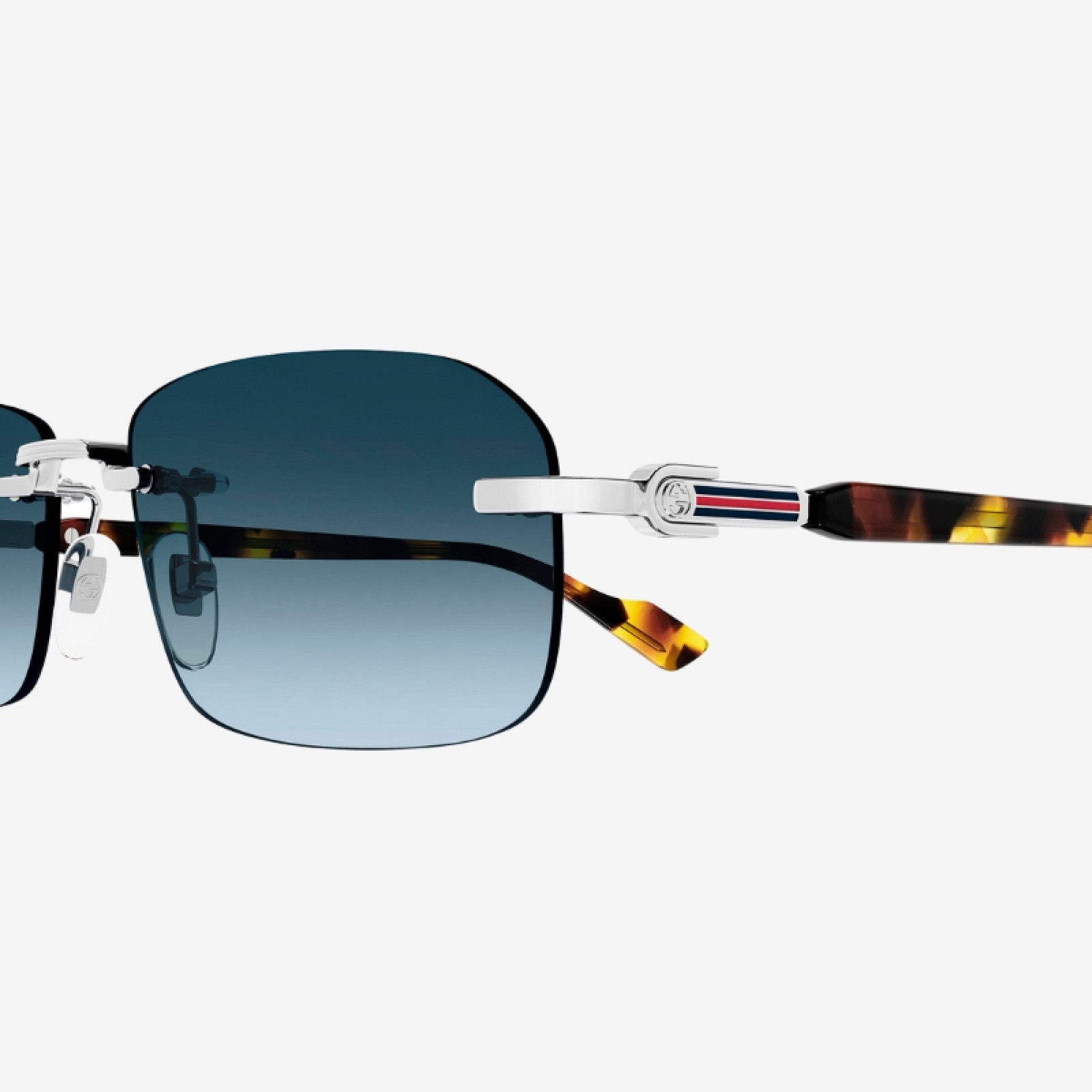Gli occhiali da sole Gucci GG1221S 007 offrono un design rettangolare in metallo argento, ispirato a creazioni vintage reinterpretate in chiave urbana. Le lenti presentano una doppia sfumatura blu e azzurro, mentre le raffinate aste sono decorate con il logo GG in colore argento e dettagli in smalto che richiamano il motivo Web. I terminali in acetato havana completano il look.