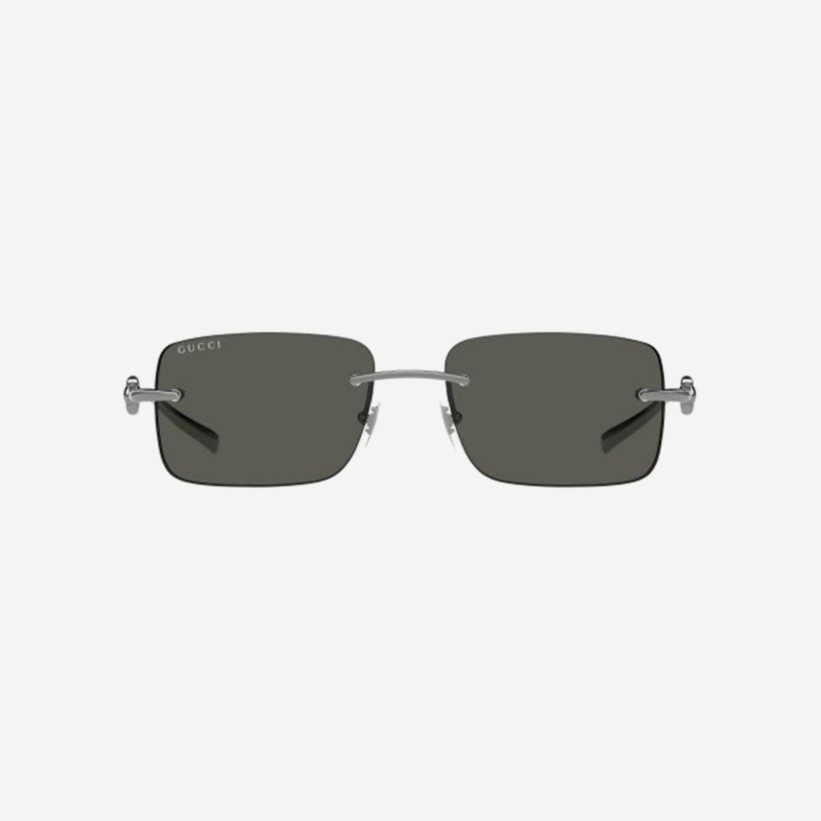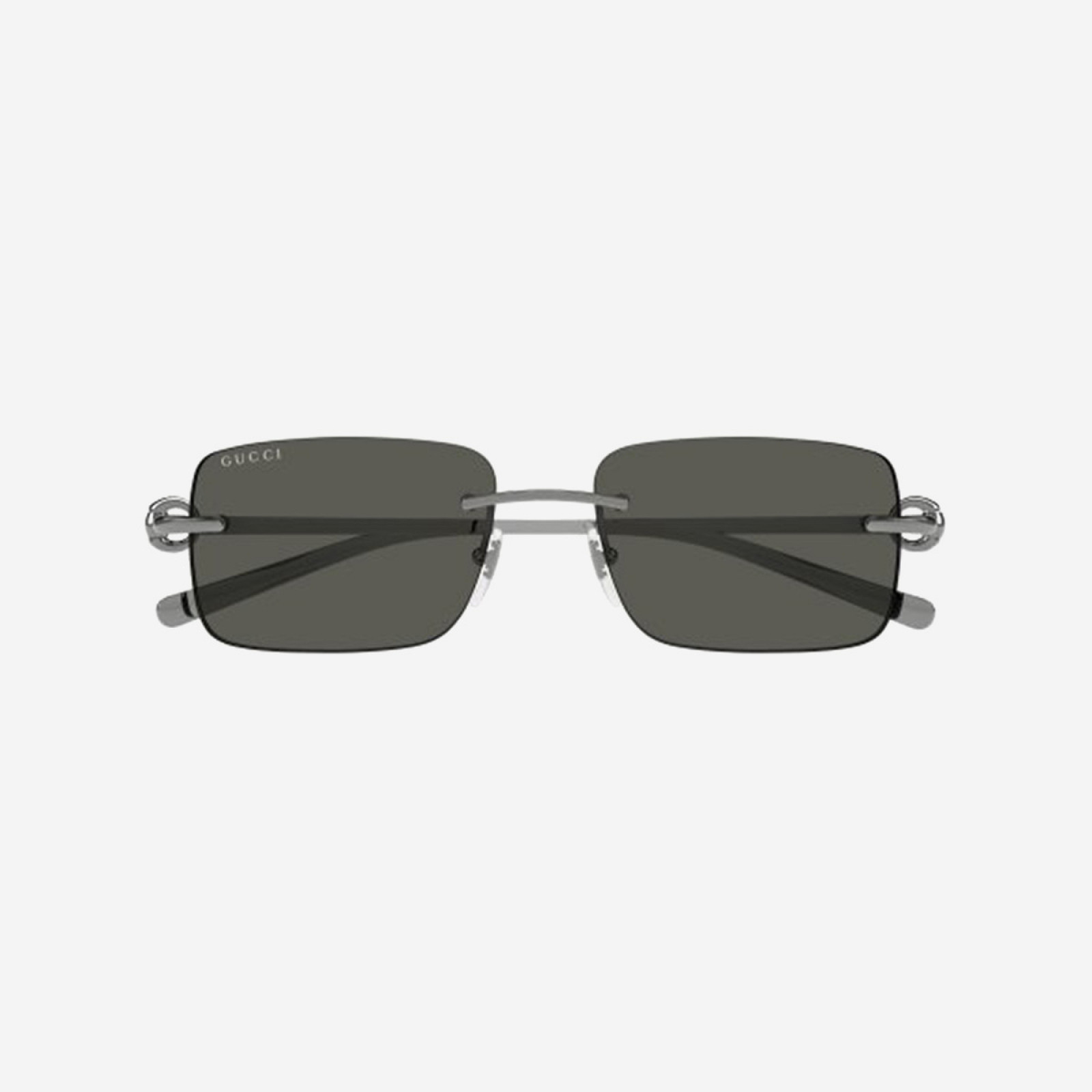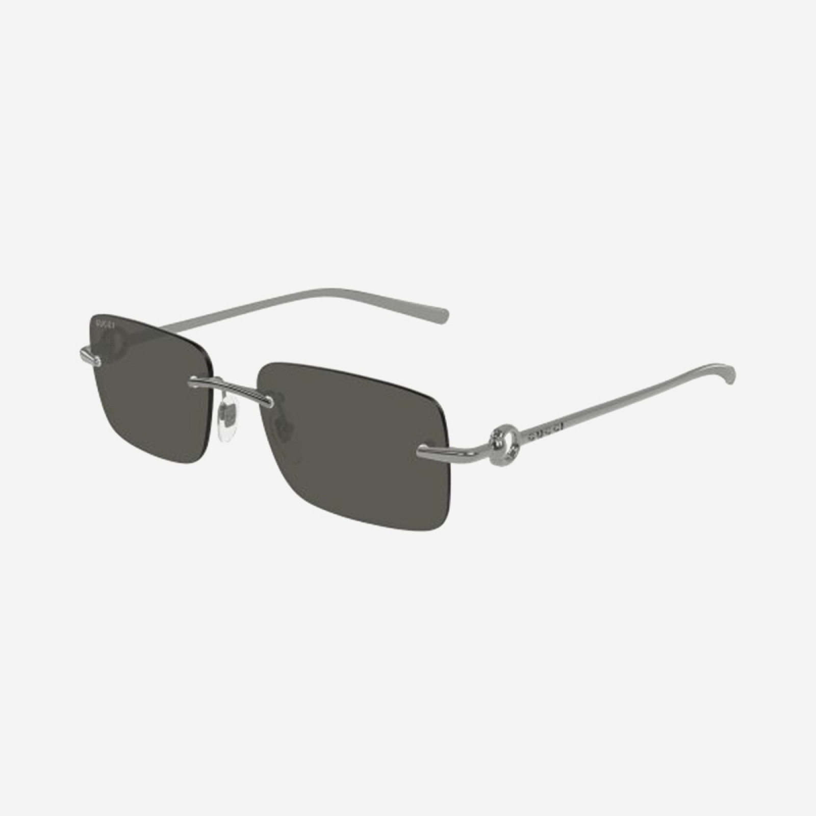 Gli occhiali da sole Gucci GG1703S-001 presentano una montatura in metallo rutenio lucido con lenti grigie in bio-nylon. La forma rettangolare senza montatura e il dettaglio Horsebit sulle aste conferiscono un design distintivo. Dimensioni: 55 mm (calibro), 17 mm (ponte), 140 mm (aste). Un accessorio di lusso che unisce eleganza e modernità.