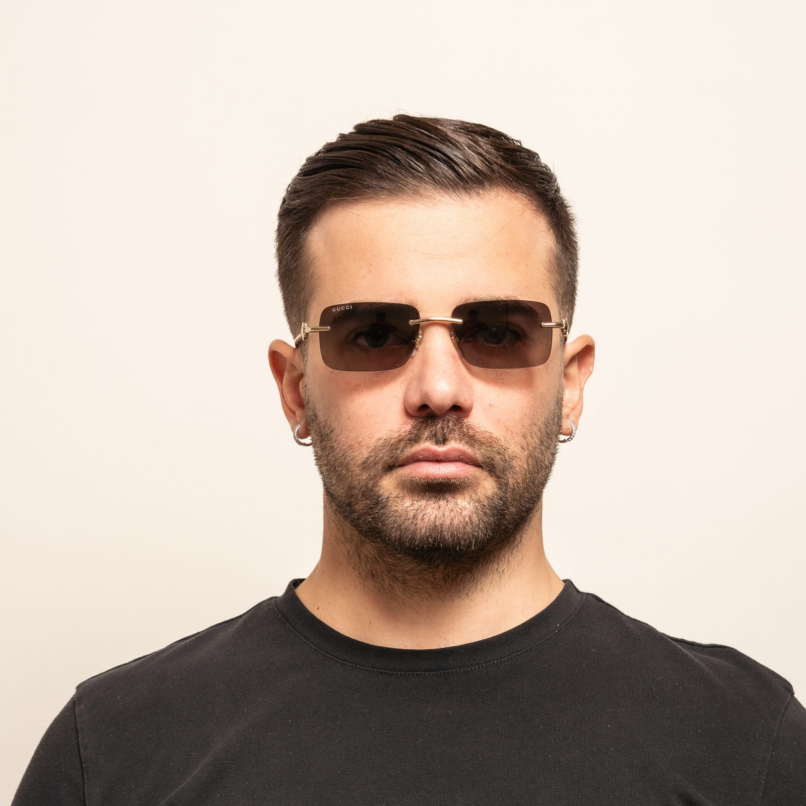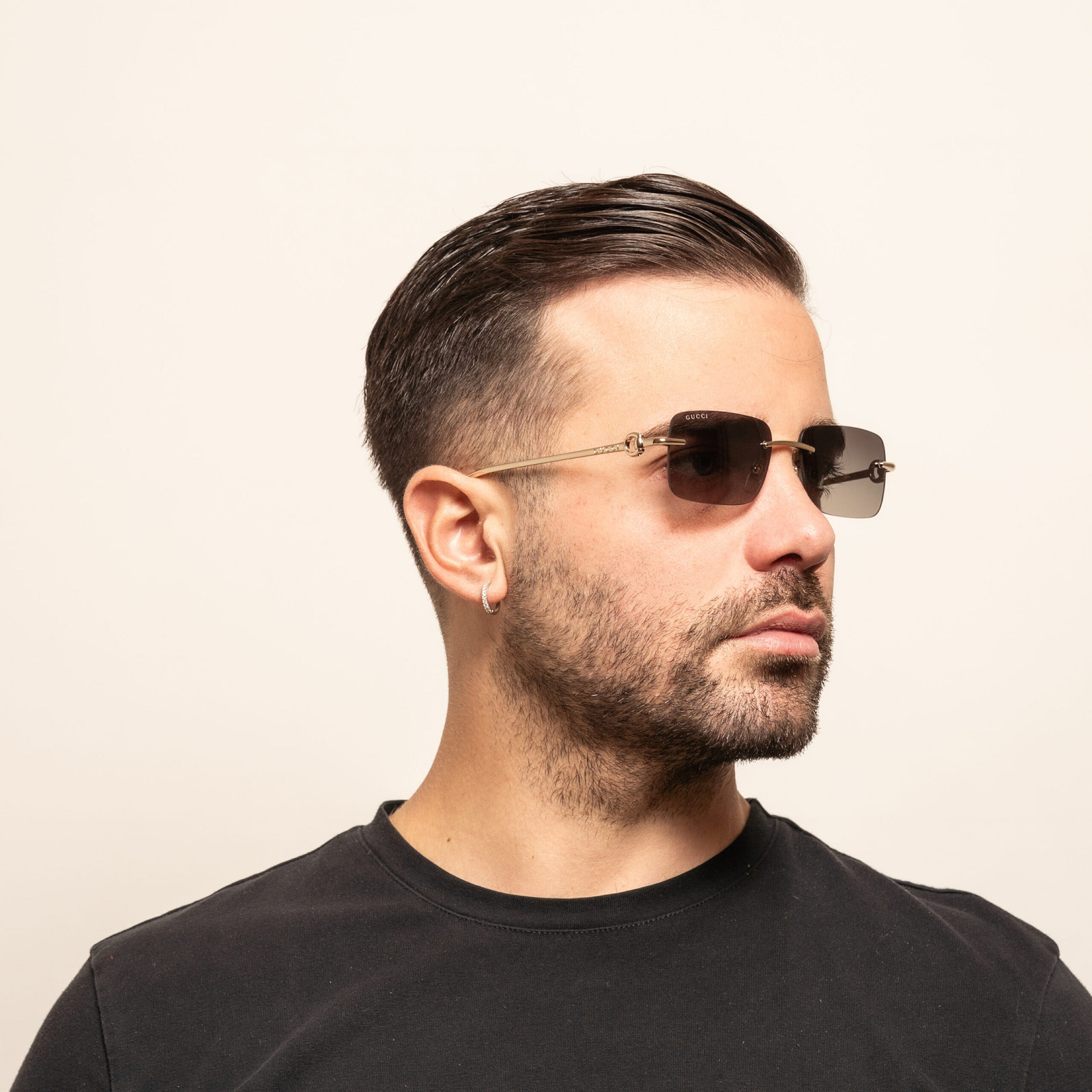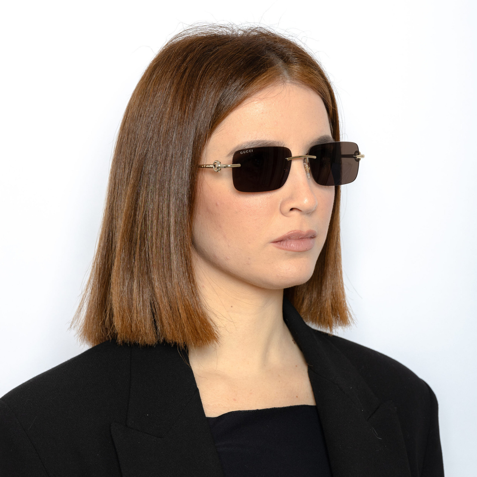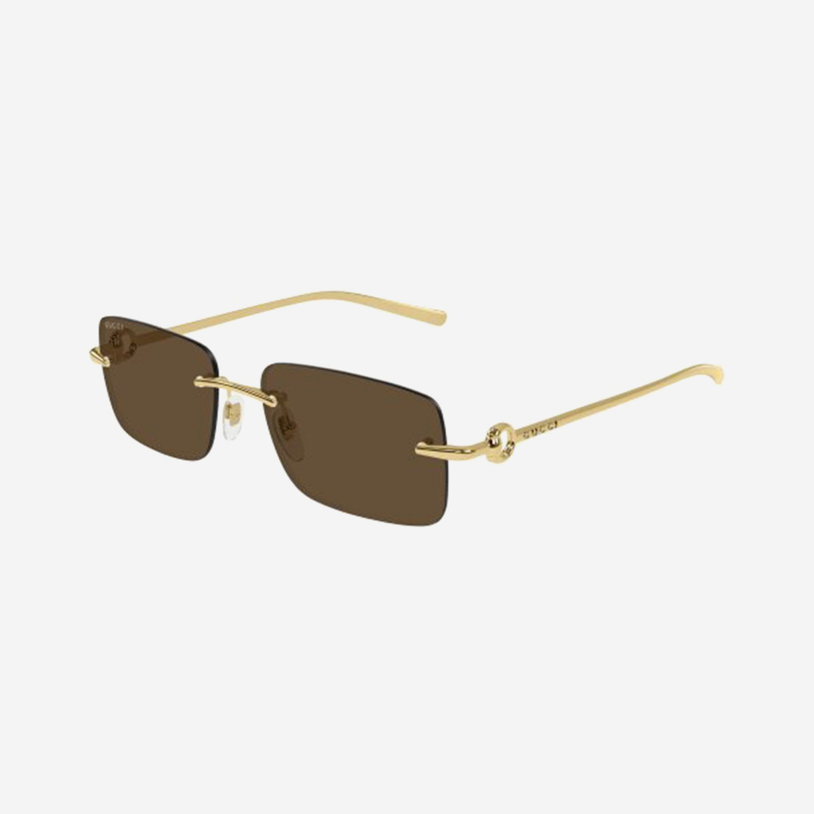 Gli occhiali da sole Gucci modello GG1703S-004 presentano una montatura in metallo dorato con lenti marroni, offrendo un design elegante e moderno. La forma rettangolare senza montatura conferisce un aspetto sofisticato, adatto sia per uomini che per donne.