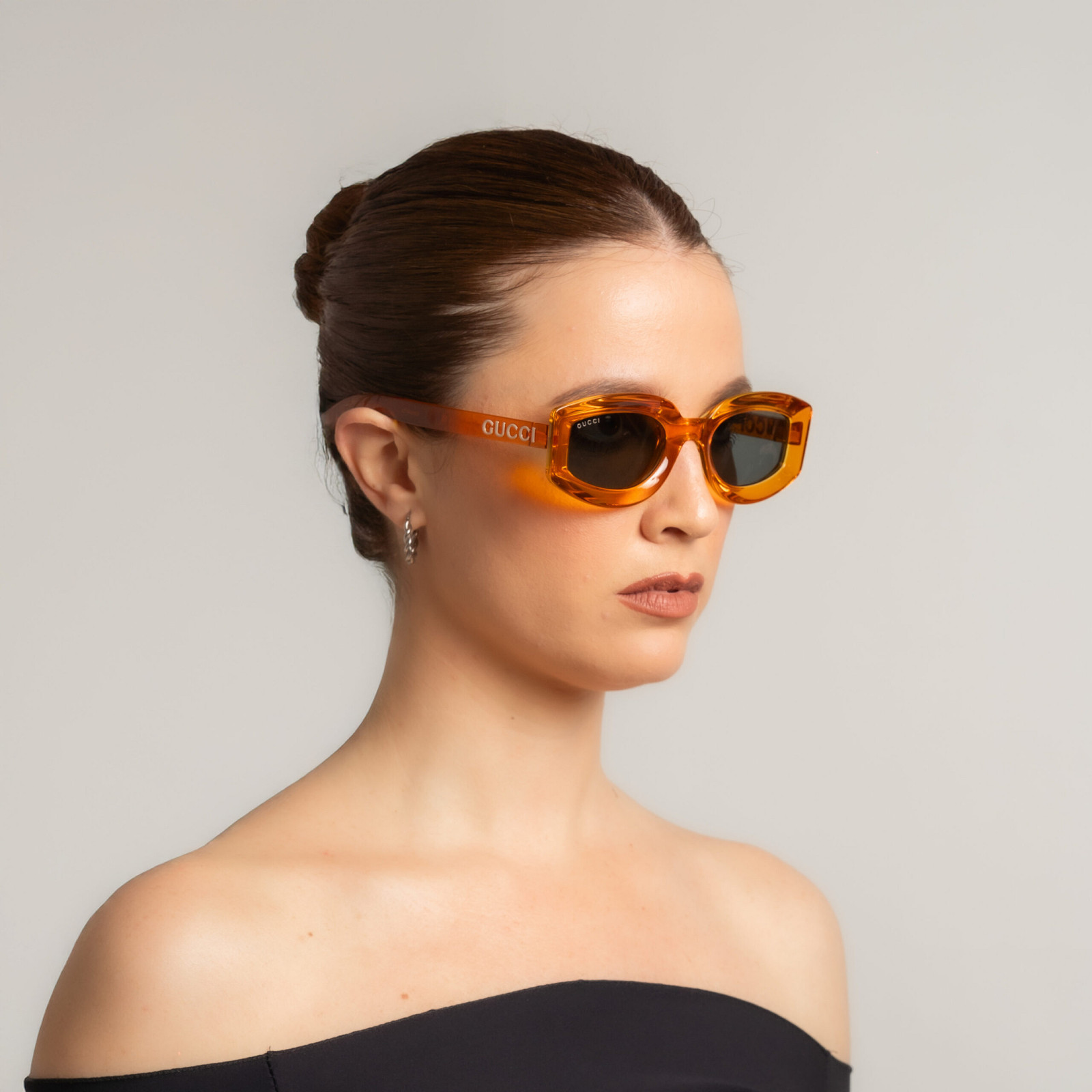 Gli occhiali da sole Gucci GG1719S-005 presentano una montatura geometrica in acetato arancione trasparente lucido, con lenti grigie che offrono protezione UV400. Le aste sono impreziosite dal logo “Gucci” in rilievo, aggiungendo un tocco distintivo al design. Questo modello combina eleganza e funzionalità, ideale per chi cerca un accessorio di alta qualità e stile.