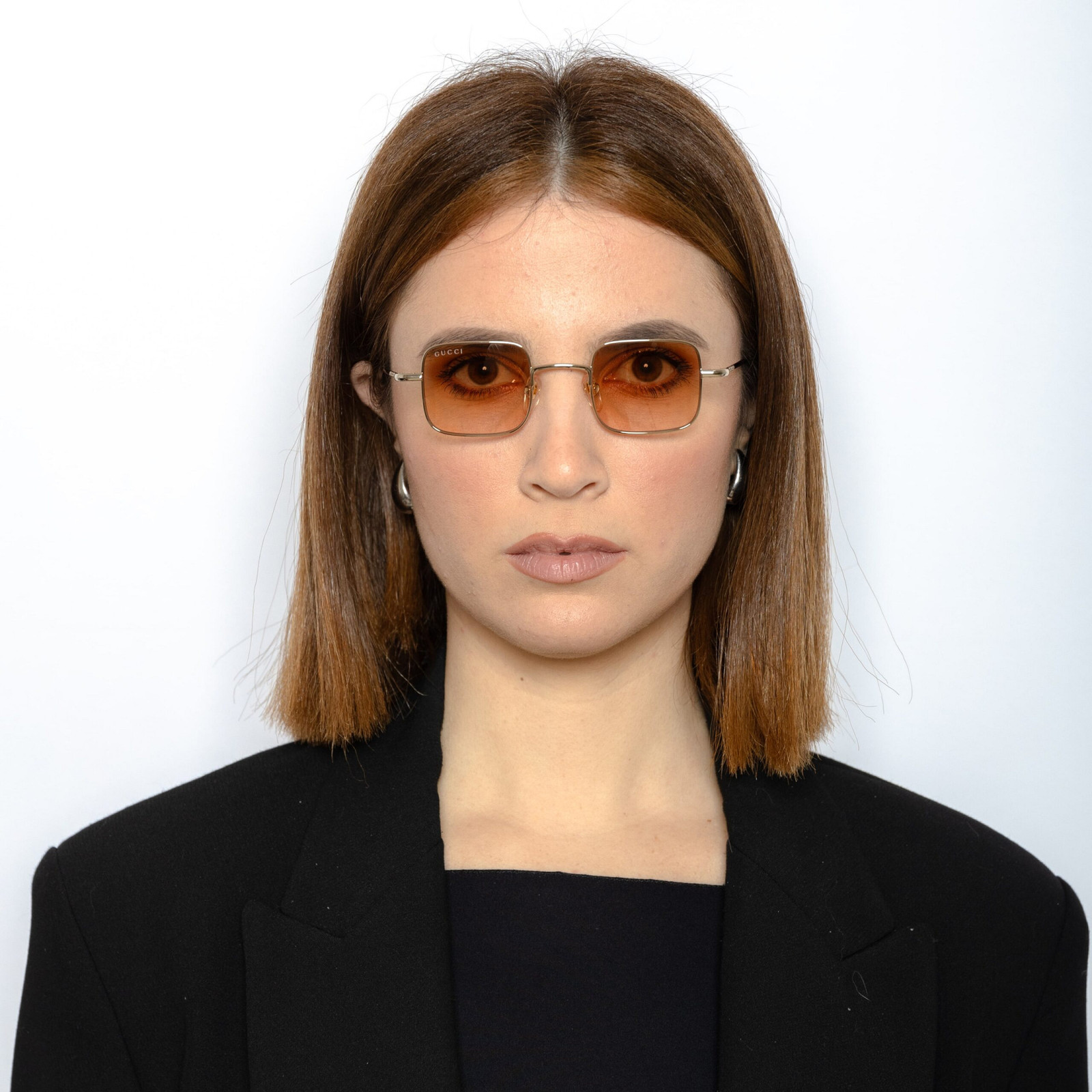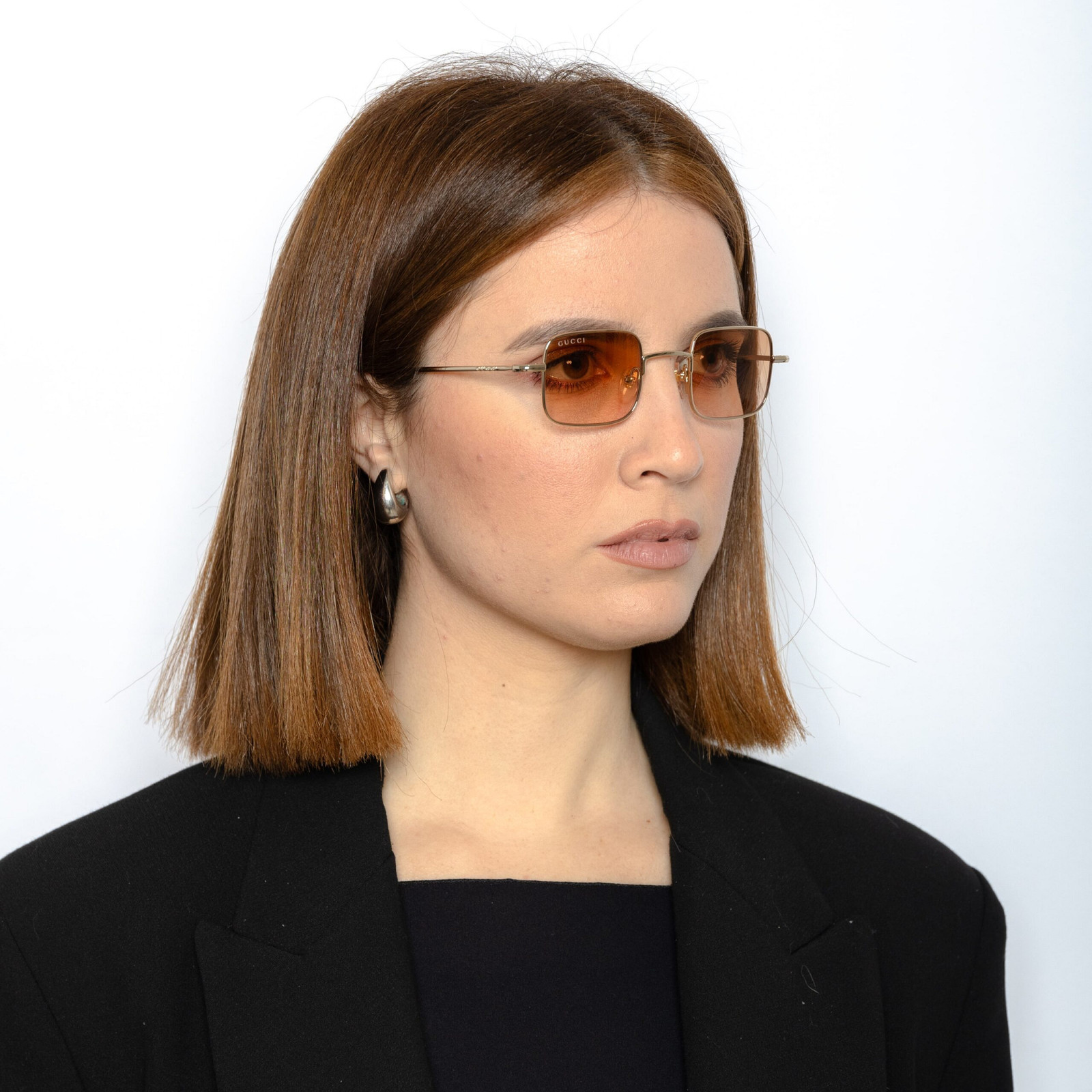 Gli occhiali da sole Gucci GG1813S 004 presentano una montatura rettangolare in metallo color oro lucido, abbinata a lenti in bio-nylon con doppia sfumatura arancione e rosa. Questo design unisce l’eleganza distintiva di Gucci a materiali di alta qualità, offrendo un accessorio sofisticato e funzionale per la protezione solare.