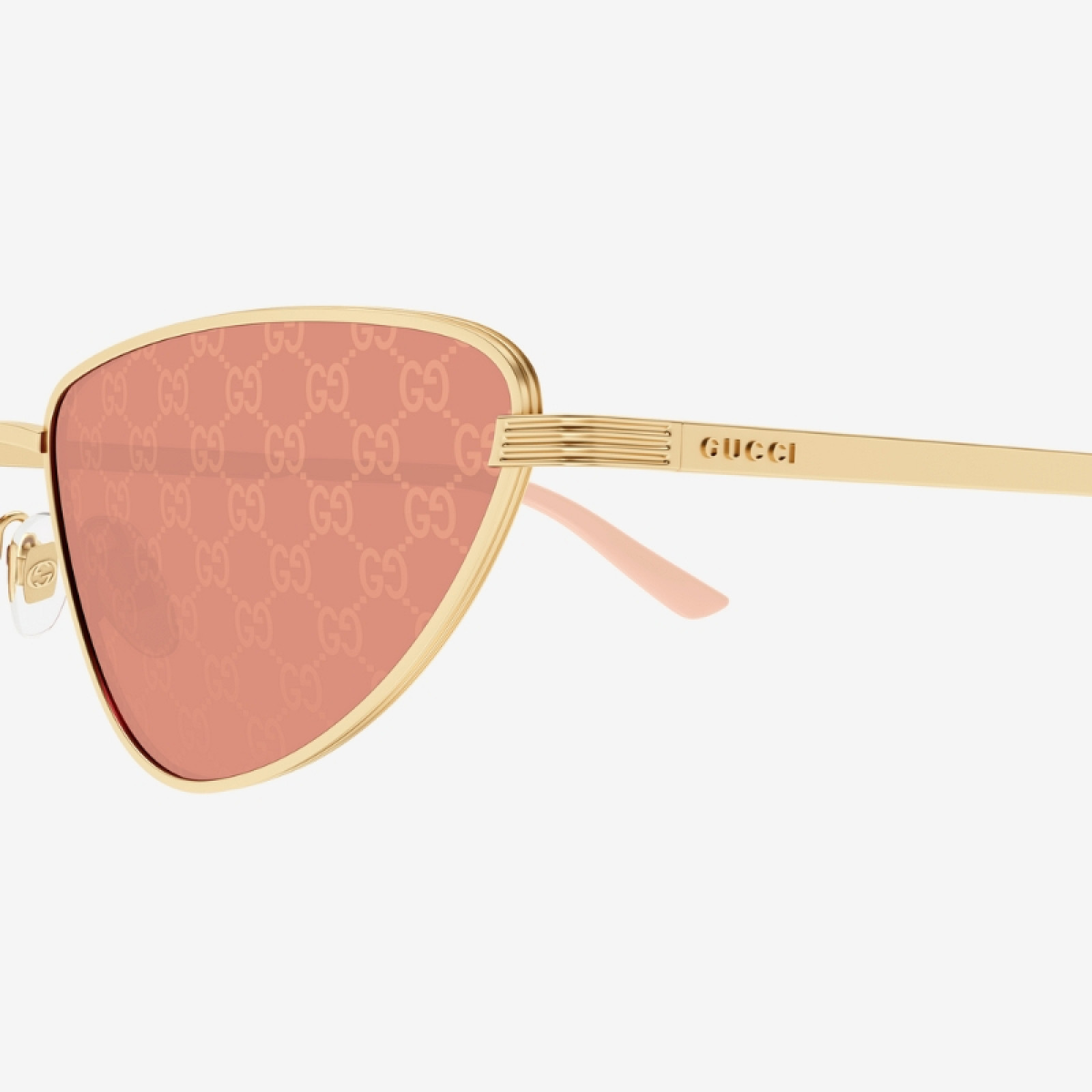 Gli occhiali da sole Gucci modello GG1879S nella variante 004 presentano una montatura cat-eye in metallo dorato, abbinata a lenti rosse con motivo monogramma Gucci. Questo design audace e sofisticato è impreziosito dal logo Gucci inciso sulle aste, offrendo un tocco distintivo e alla moda. Le lenti garantiscono una protezione UV al 100%, assicurando sia stile che funzionalità.