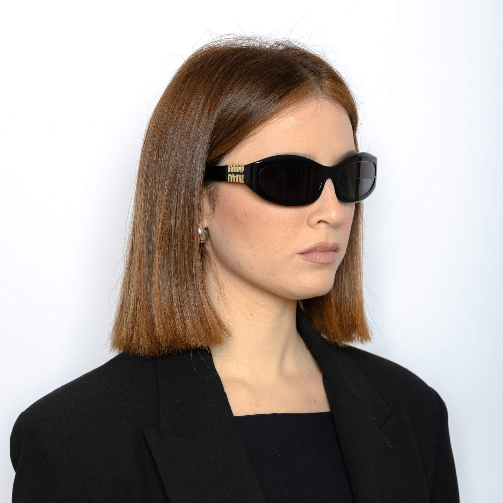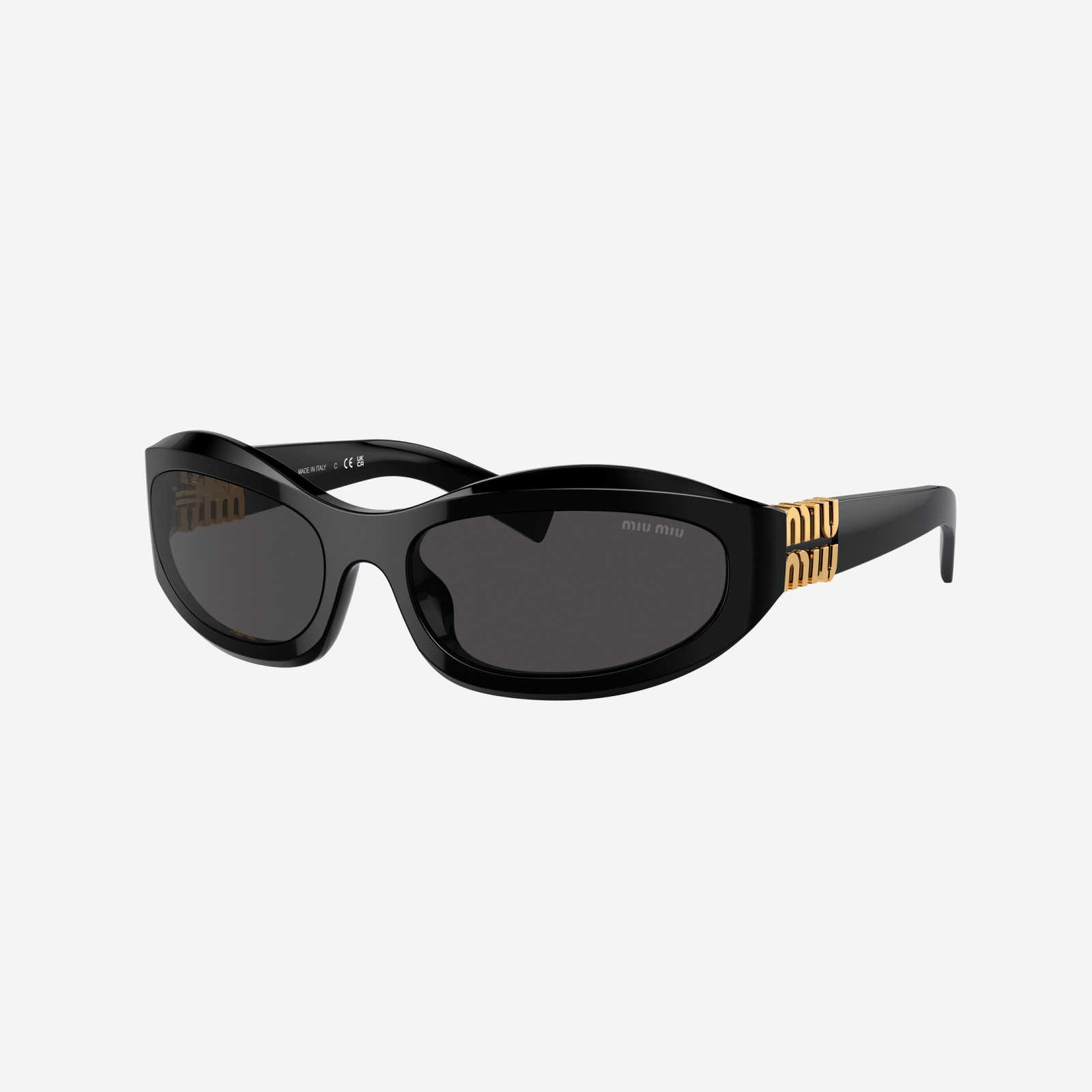 Gli occhiali da sole Miu Miu modello 0MU 14ZS – 16K08Z presentano una montatura nera in acetato con lenti grigio scuro in poliammide bio. Le aste in metallo aggiungono un tocco di eleganza al design. Questo modello offre una protezione UV ottimale, unendo stile e funzionalità per un look sofisticato e moderno.