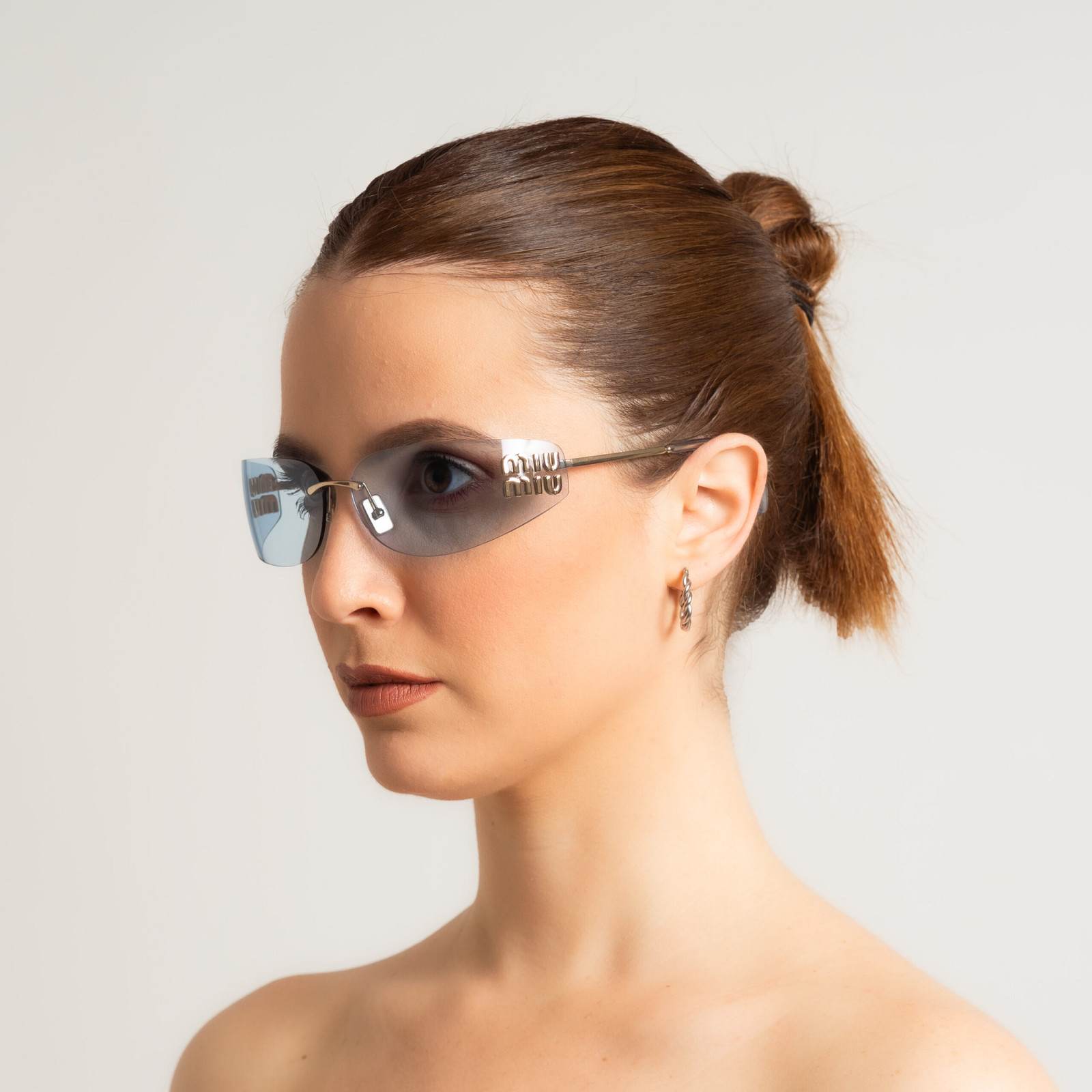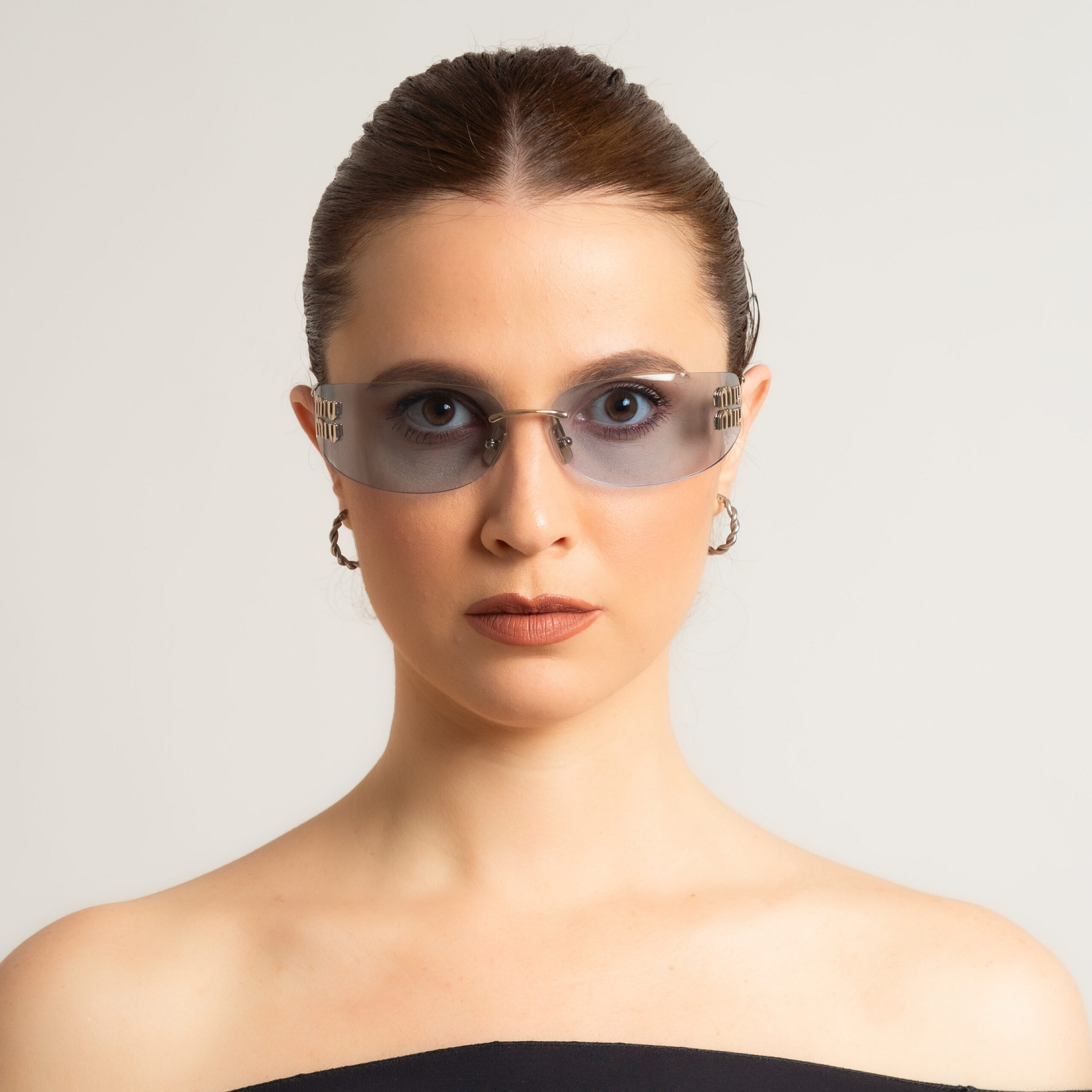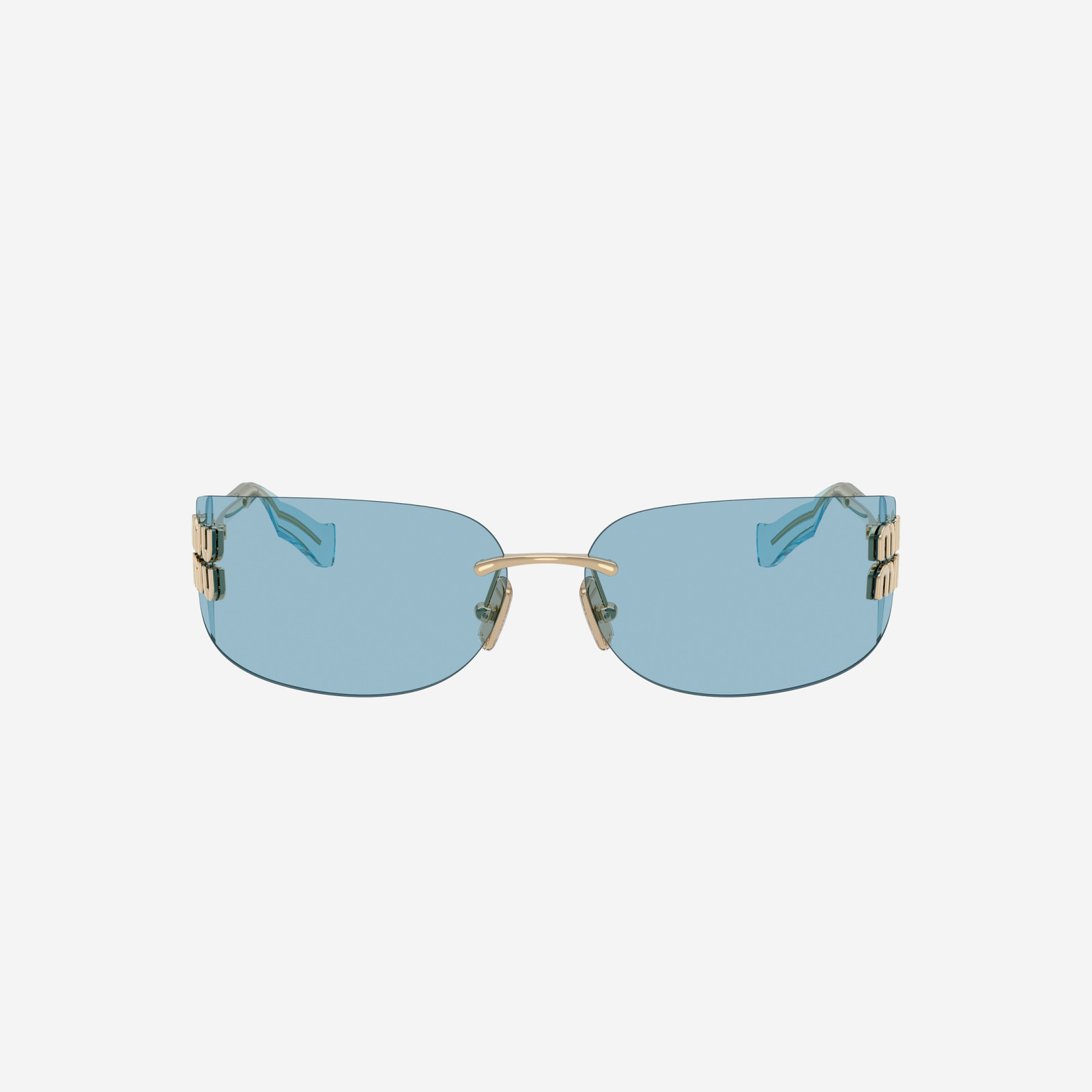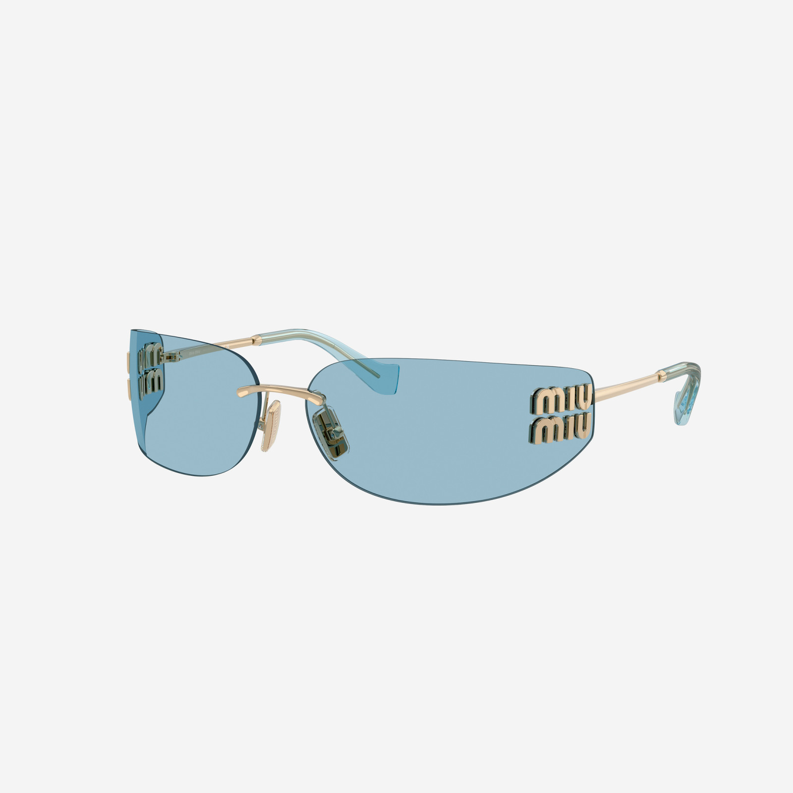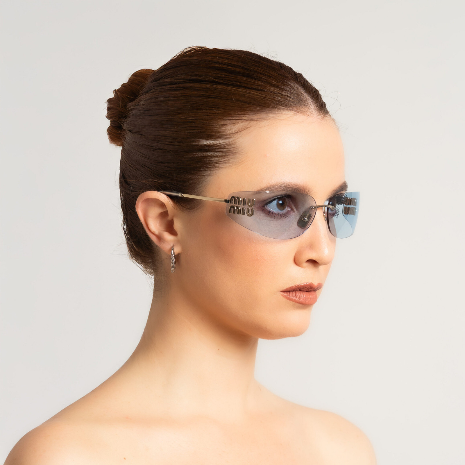 Gli occhiali da sole Miu Miu modello 0MU A51S nella variante ZVN10P presentano una montatura rettangolare senza montatura in metallo color oro pallido, abbinata a lenti in policarbonato di colore azzurro chiaro. Le dimensioni della montatura sono: larghezza lenti 75 mm, ponte 14 mm e lunghezza aste 110 mm, garantendo una vestibilità confortevole. Questo design audace e sofisticato riflette lo stile distintivo di Miu Miu, ideale per chi desidera un accessorio alla moda.