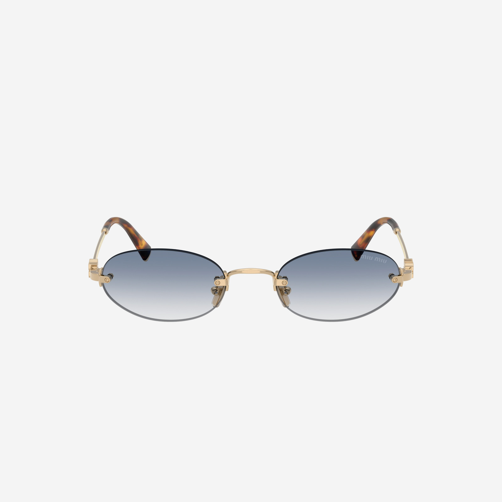 Gli occhiali da sole Miu Miu 0MU A54S ZVN80O presentano una montatura in metallo color oro pallido con lenti sfumate azzurre. Il design ovale senza montatura offre leggerezza ed eleganza, mentre le aste sottili, impreziosite dal logo Miu Miu verticale e terminali in acetato, completano il look sofisticato. Dimensioni: lenti 51 mm, ponte 20 mm, aste 140 mm.