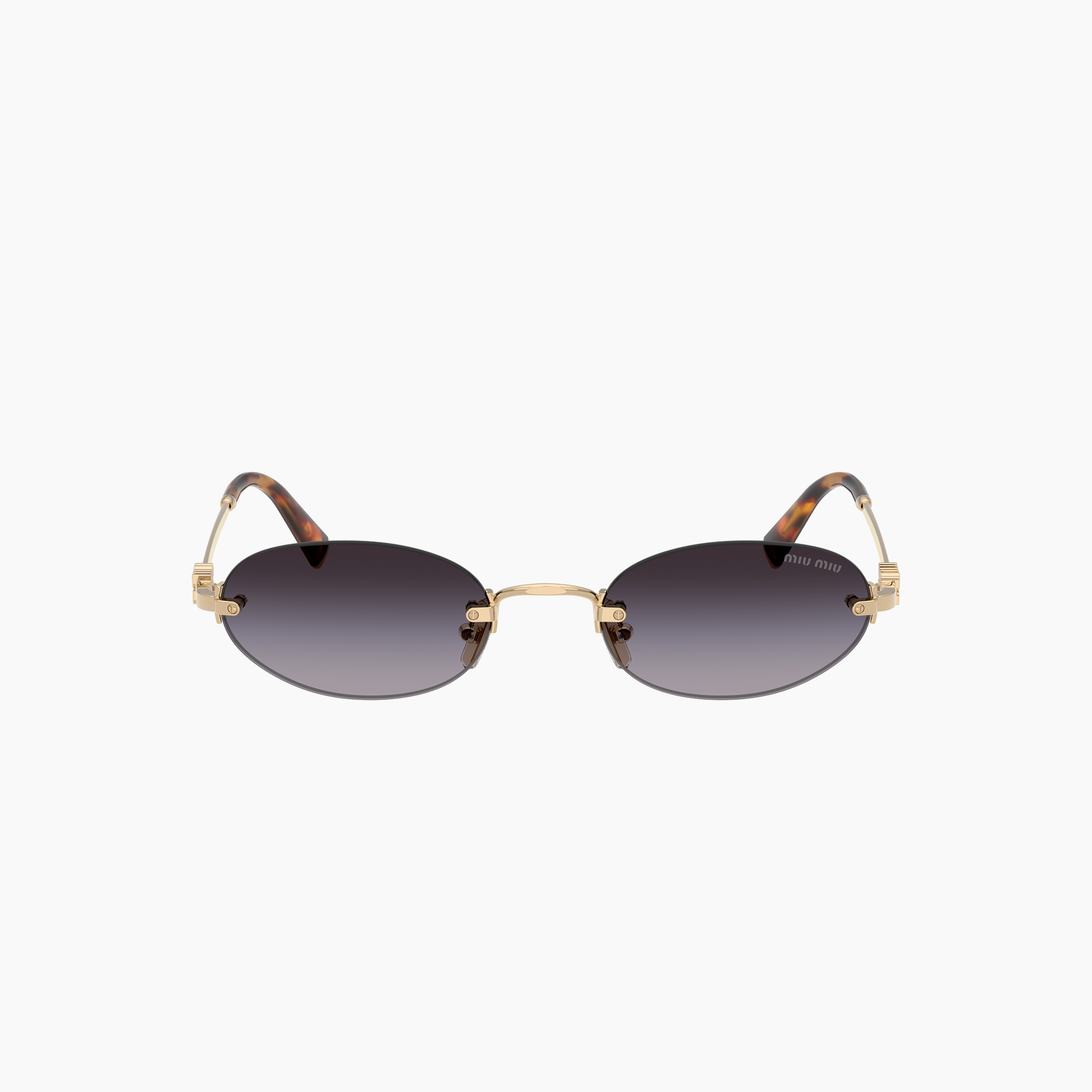 Montatura in metallo oro pallido, forma ovale moderna e lenti grigio sfumato. Un accessorio femminile raffinato, perfetto per chi ama un tocco di eleganza discreta firmata Miu Miu.