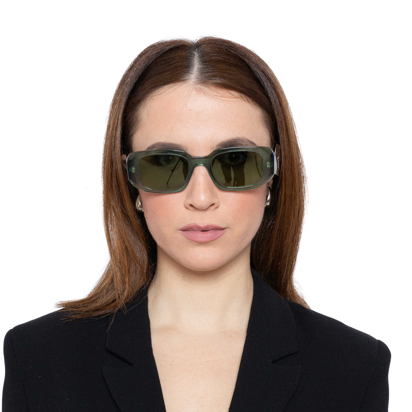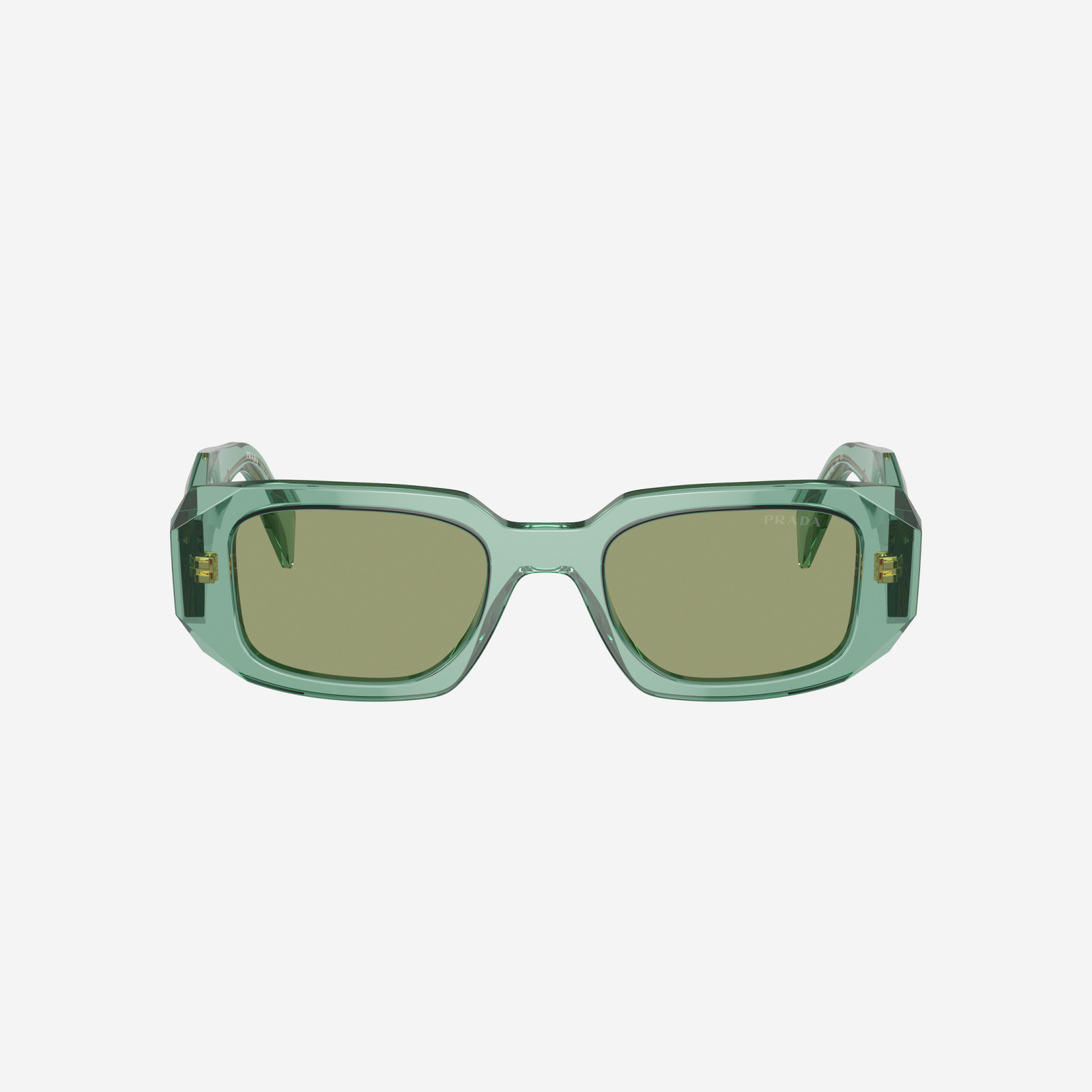 Gli occhiali da sole Prada 0PR 17WS nella variante 11R10E presentano una montatura rettangolare in acetato trasparente salvia, abbinata a lenti verdi con specchiatura argento interna. Questo design elegante e sofisticato è ideale per chi cerca un accessorio di alta moda che unisce stile e funzionalità.