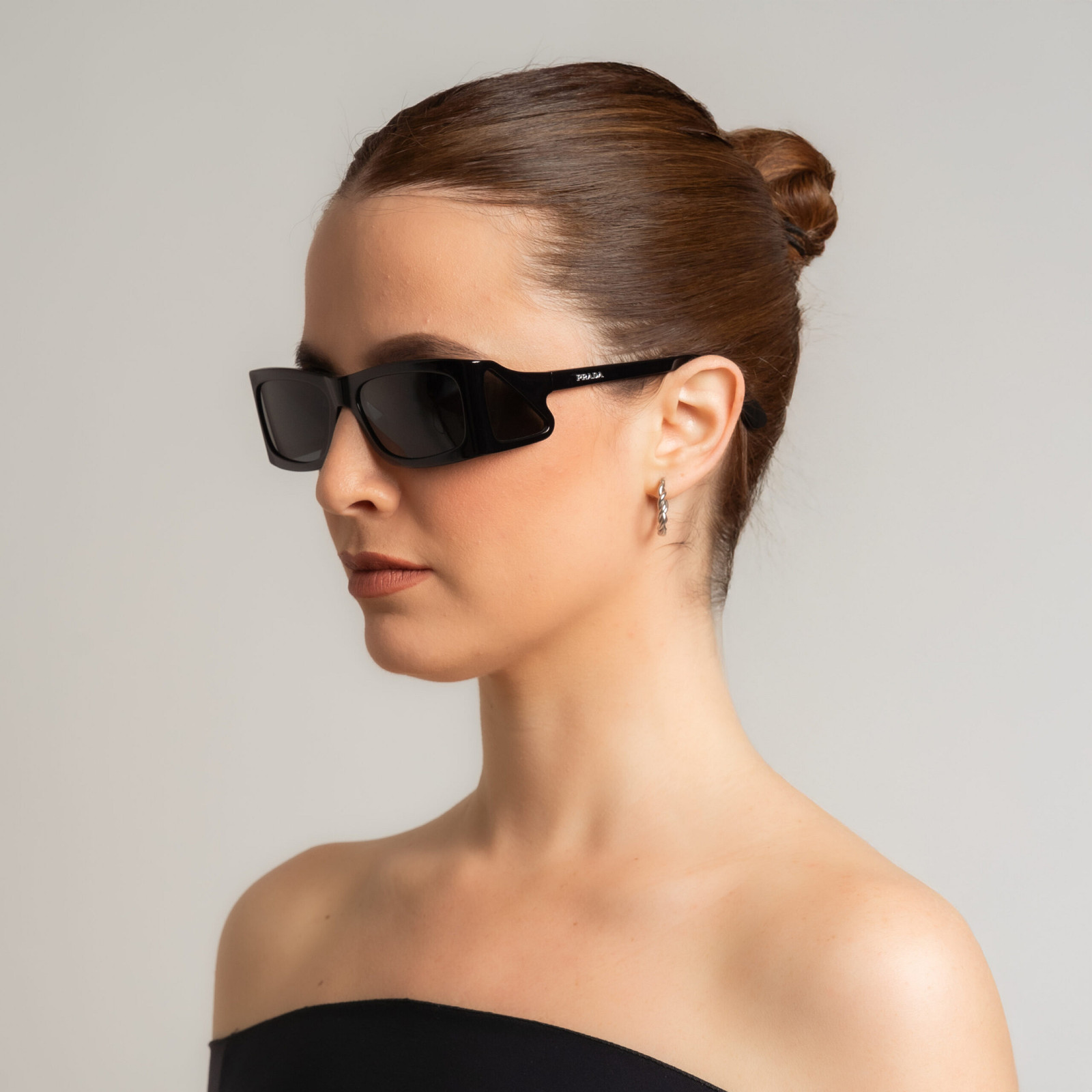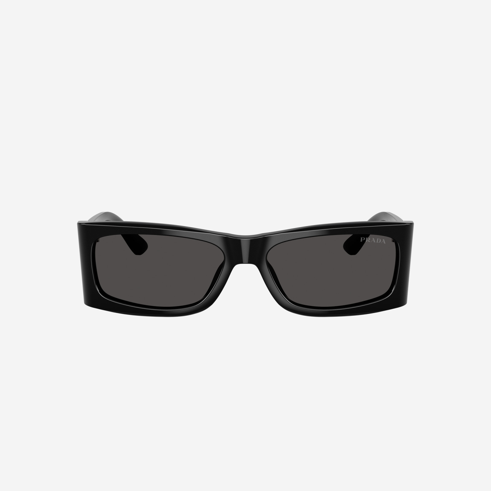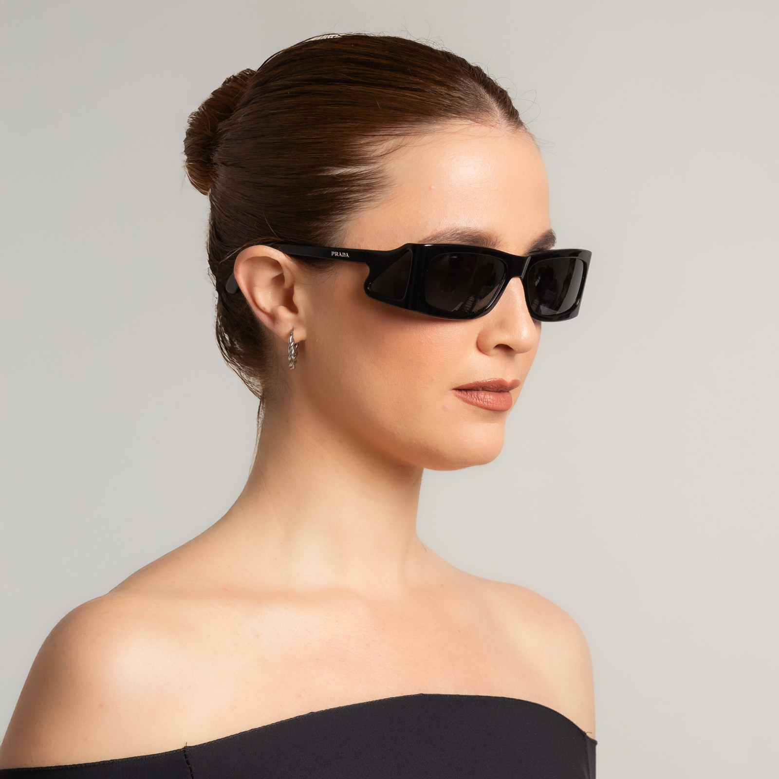 Gli occhiali da sole Prada modello PR B03S nella variante colore 1AB5S0 presentano una montatura rettangolare in acetato nero, abbinata a lenti in poliammide di colore grigio scuro. Questo design elegante e maschile offre una vestibilità confortevole grazie al ponte alto. Parte della linea “Catwalk”, questi occhiali sono realizzati in Italia, riflettendo l’artigianalità e la qualità distintive del marchio Prada.