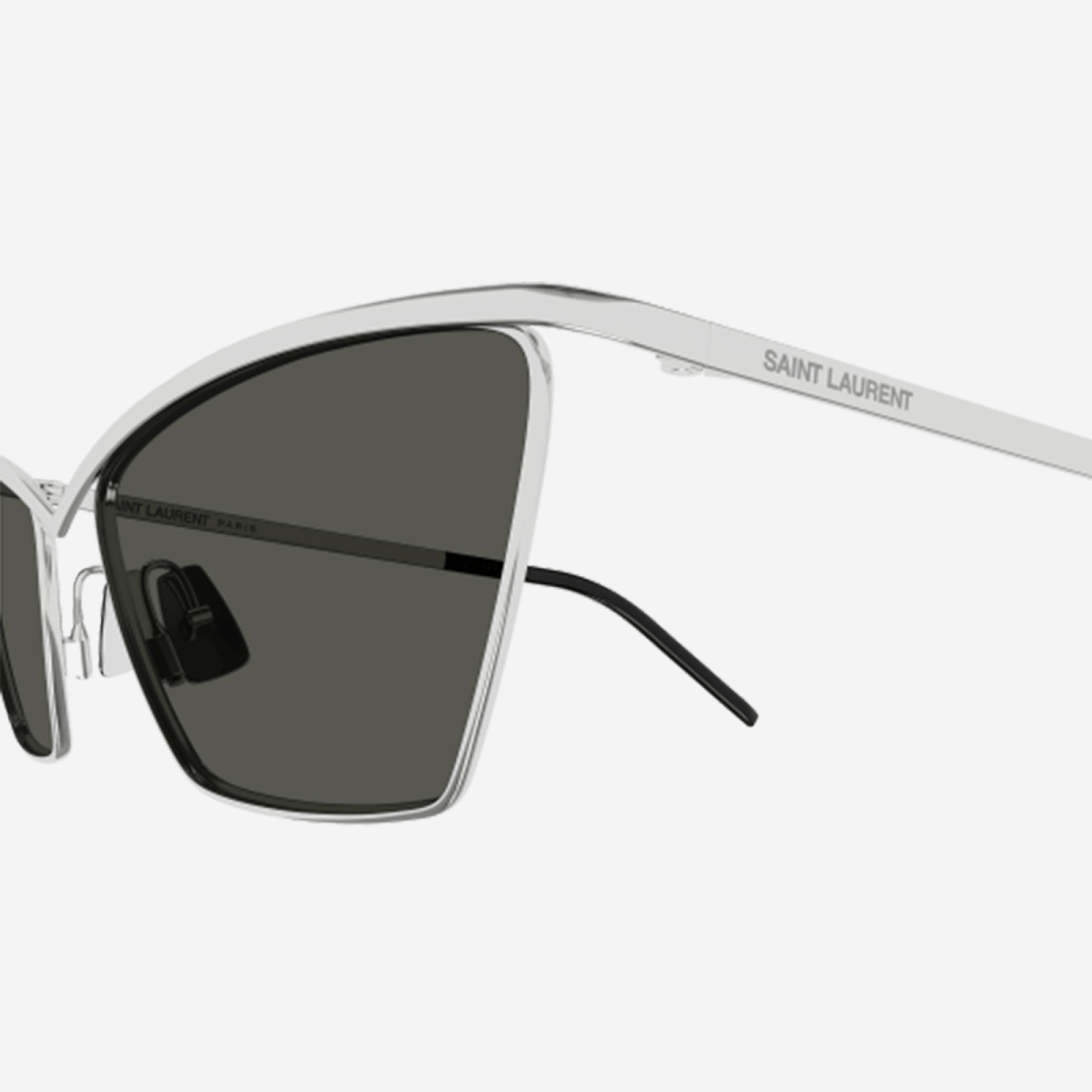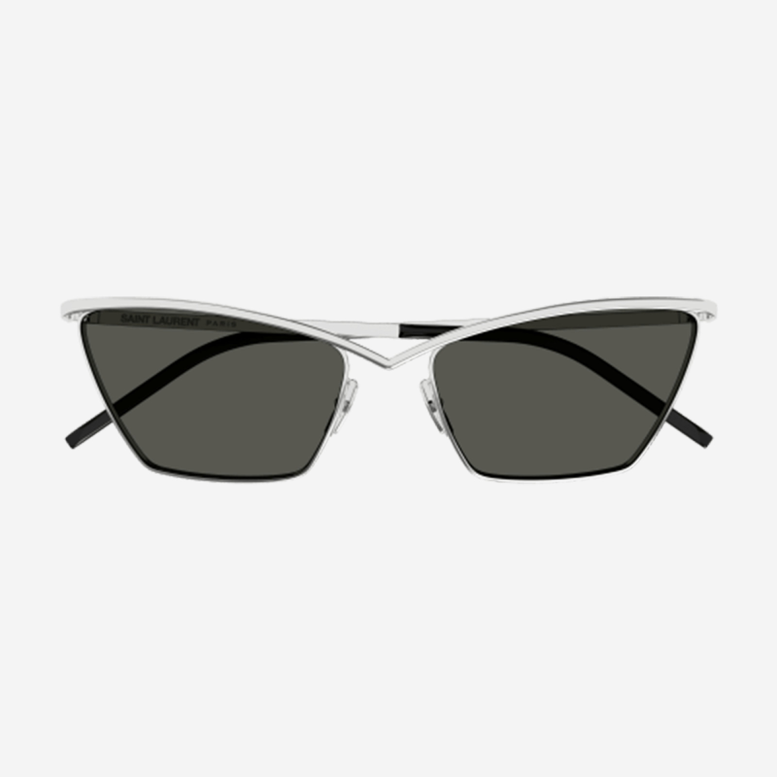 Gli occhiali da sole Saint Laurent SL 637-002 presentano una montatura metallica argentata con lenti grigie, caratterizzata da una forma cat-eye che conferisce un aspetto elegante e moderno. Le dimensioni includono una larghezza lente di 57 mm, un ponte di 17 mm e aste di 140 mm. Questo design unisex è ideale per chi cerca uno stile distintivo e sofisticato.