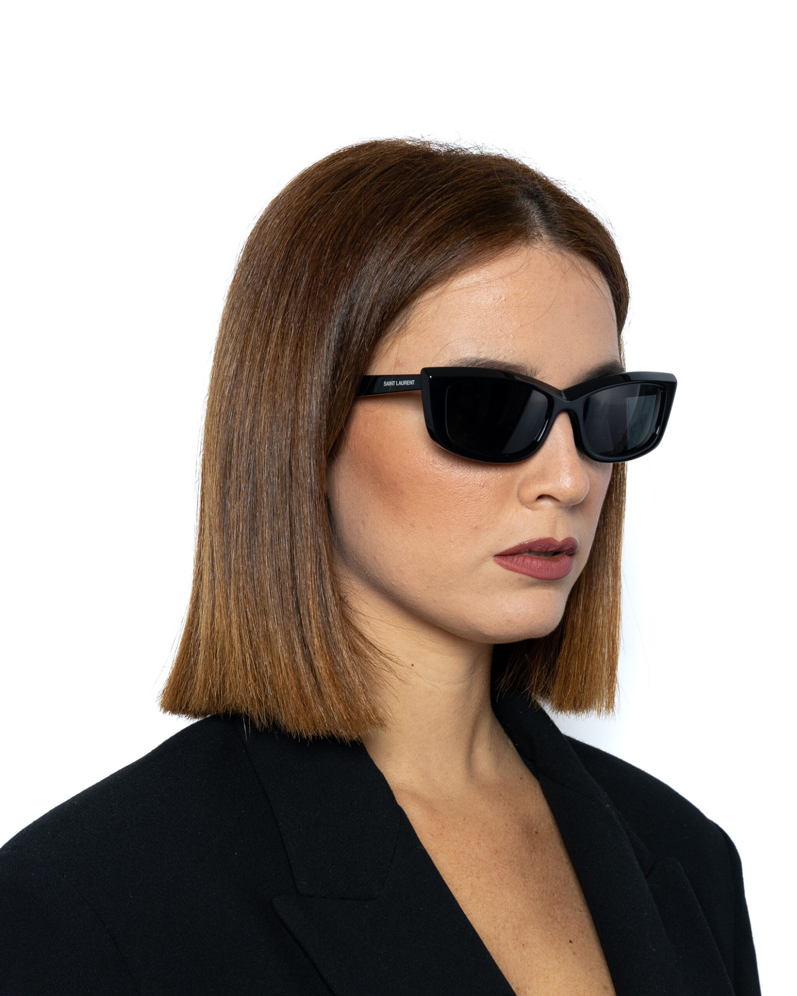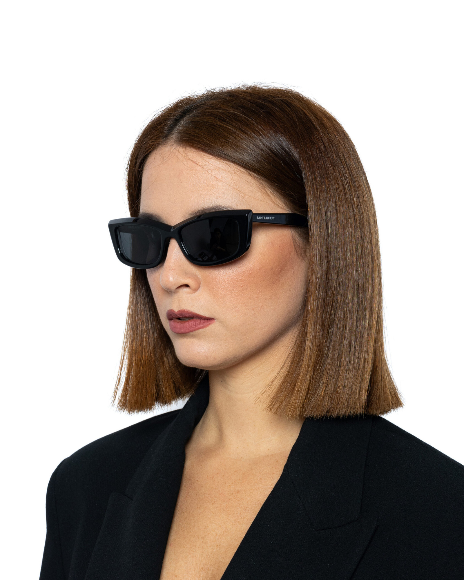 Gli occhiali da sole Saint Laurent modello SL 658-001 presentano una montatura cat-eye in acetato nero lucido, con lenti grigie che offrono protezione UV al 100%. Le dimensioni includono una larghezza delle lenti di 54 mm, un ponte di 17 mm e aste lunghe 145 mm. Il design è caratterizzato da linee audaci e dettagli raffinati, incarnando l’eleganza distintiva del marchio.
