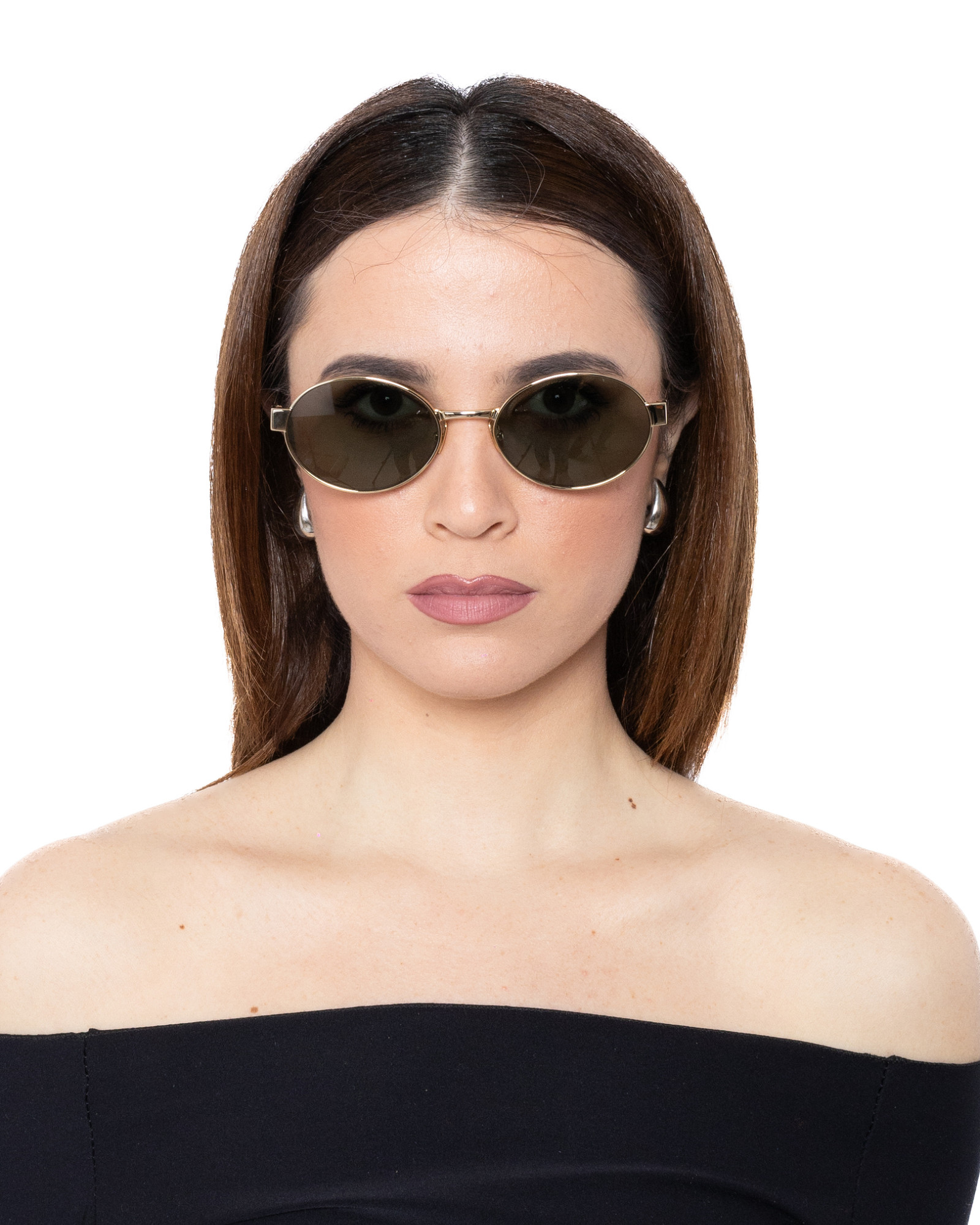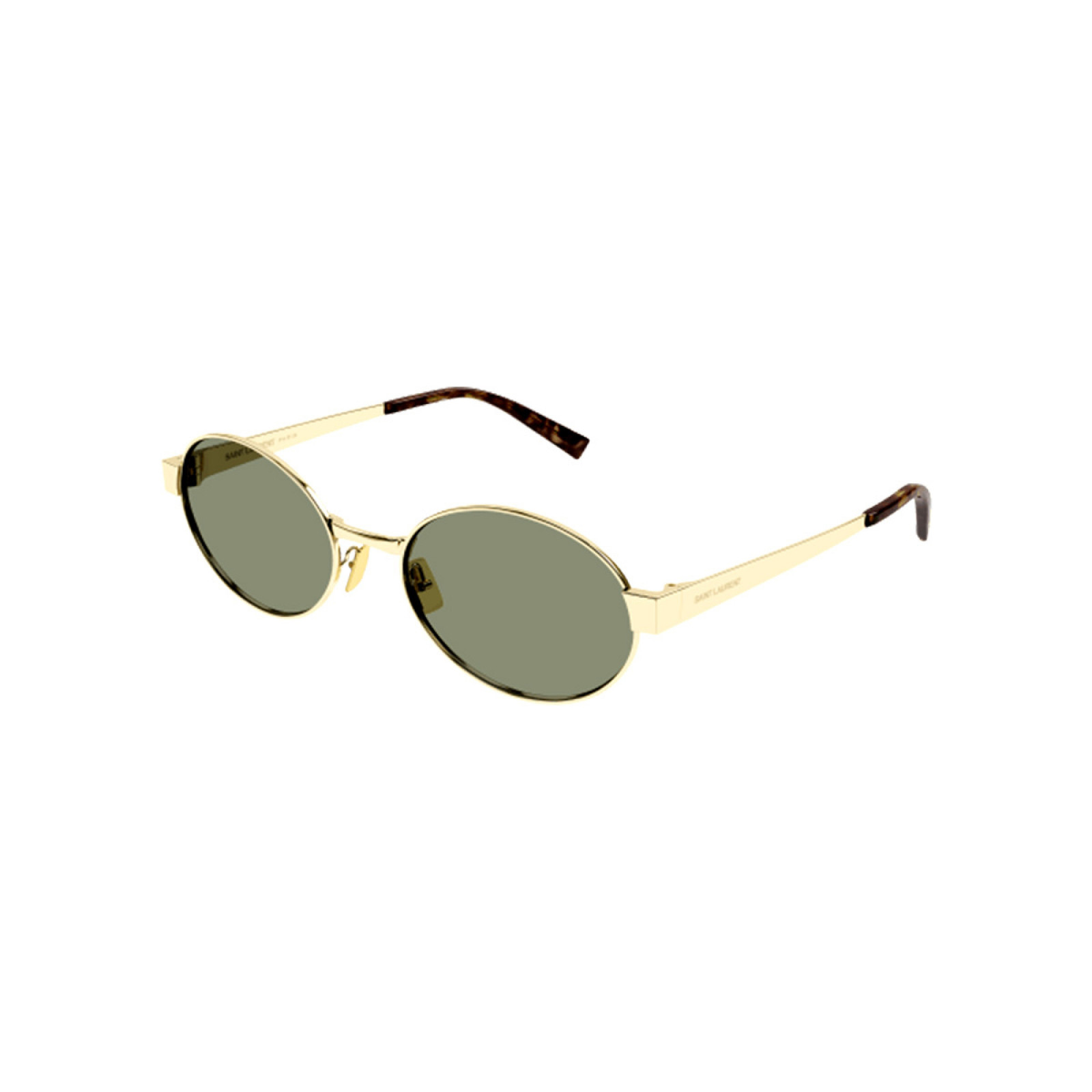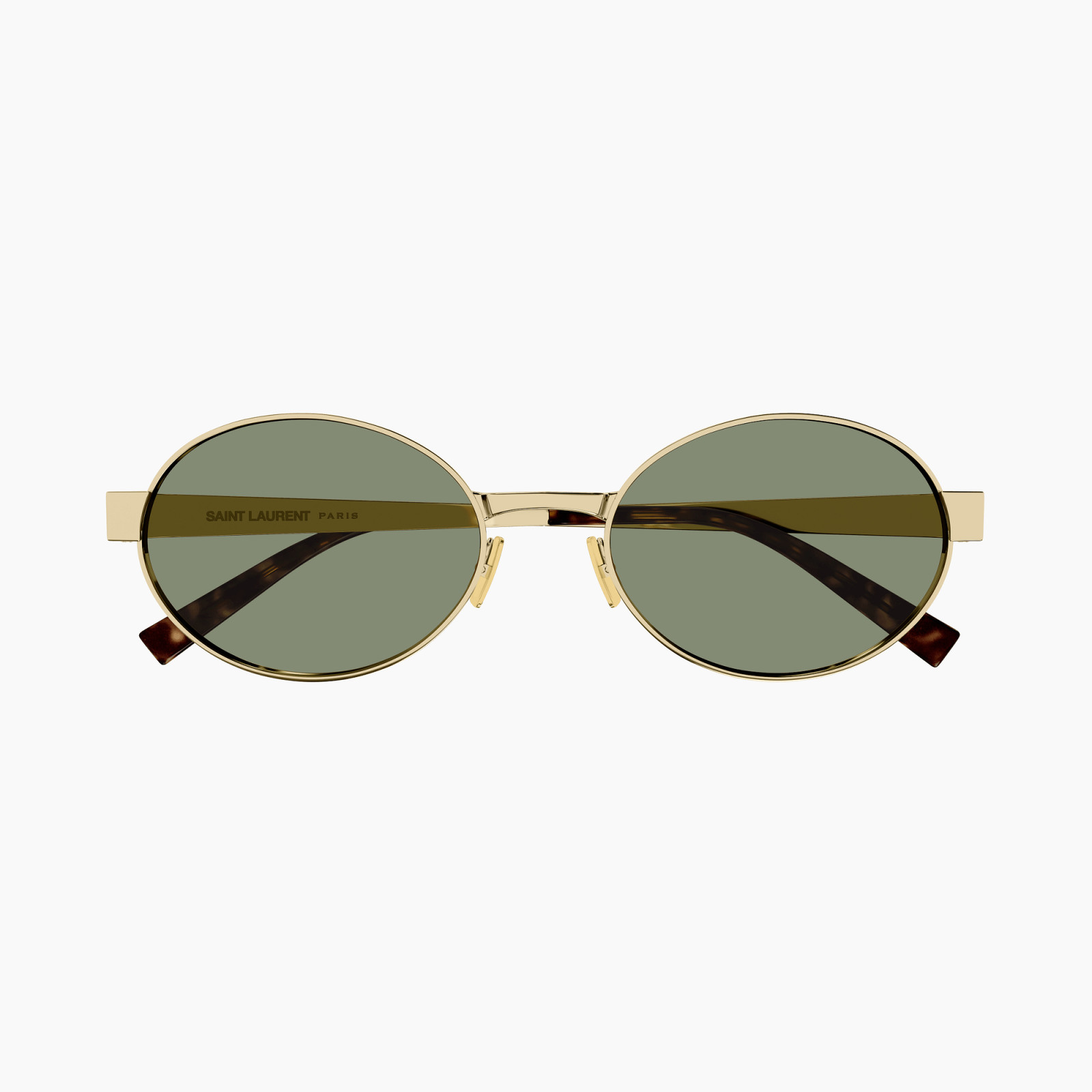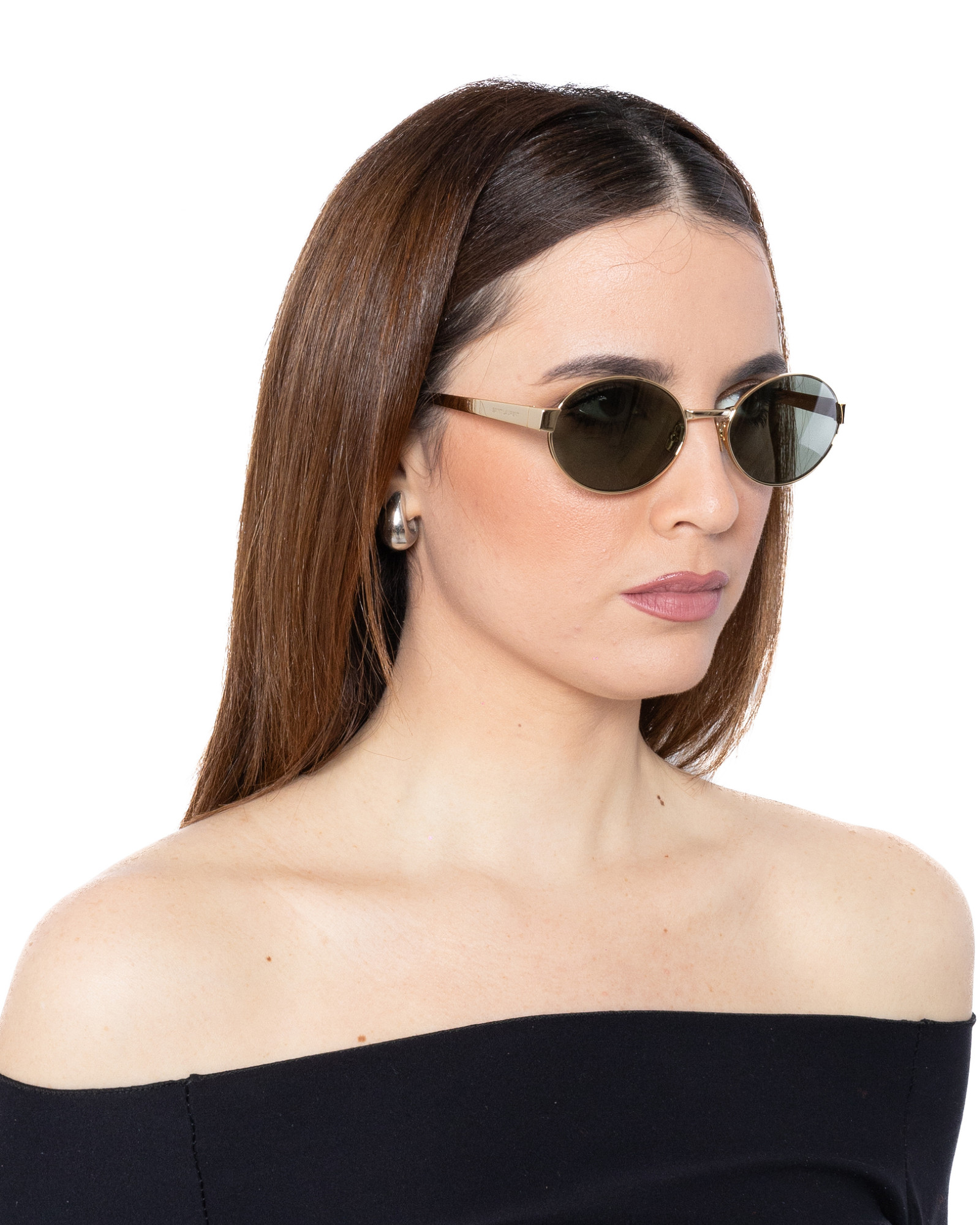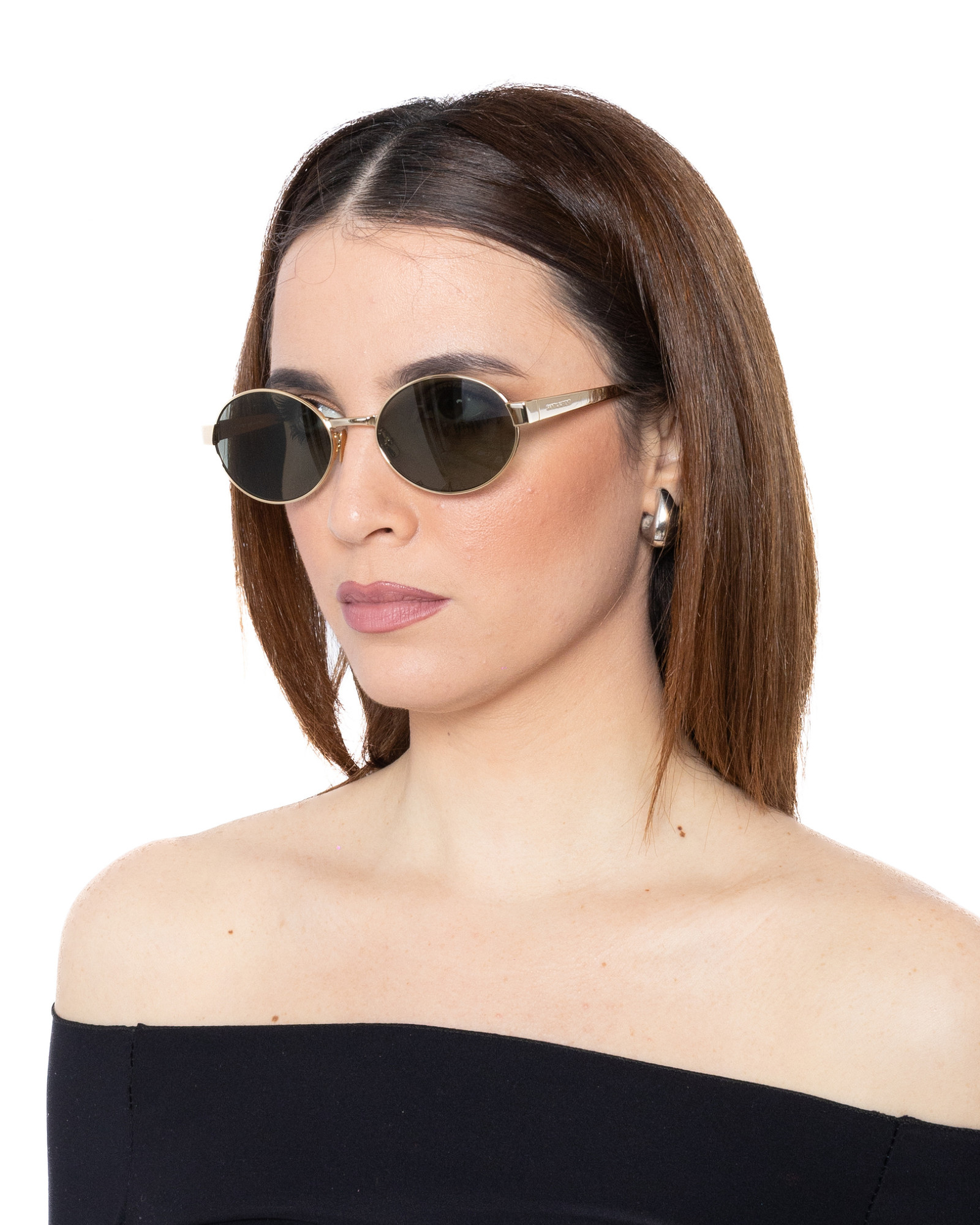 Gli occhiali da sole Saint Laurent modello SL 692-003 presentano una montatura ovale in metallo color oro chiaro lucido, ispirata al design vintage della collezione primavera 2024 di Anthony Vaccarello. Le lenti in nylon verde offrono una protezione UV al 100%. Le dimensioni includono una larghezza delle lenti di 55 mm, un ponte di 19 mm e aste lunghe 145 mm. Il logo Saint Laurent è inciso al laser sulle aste in metallo, aggiungendo un tocco distintivo al design.
