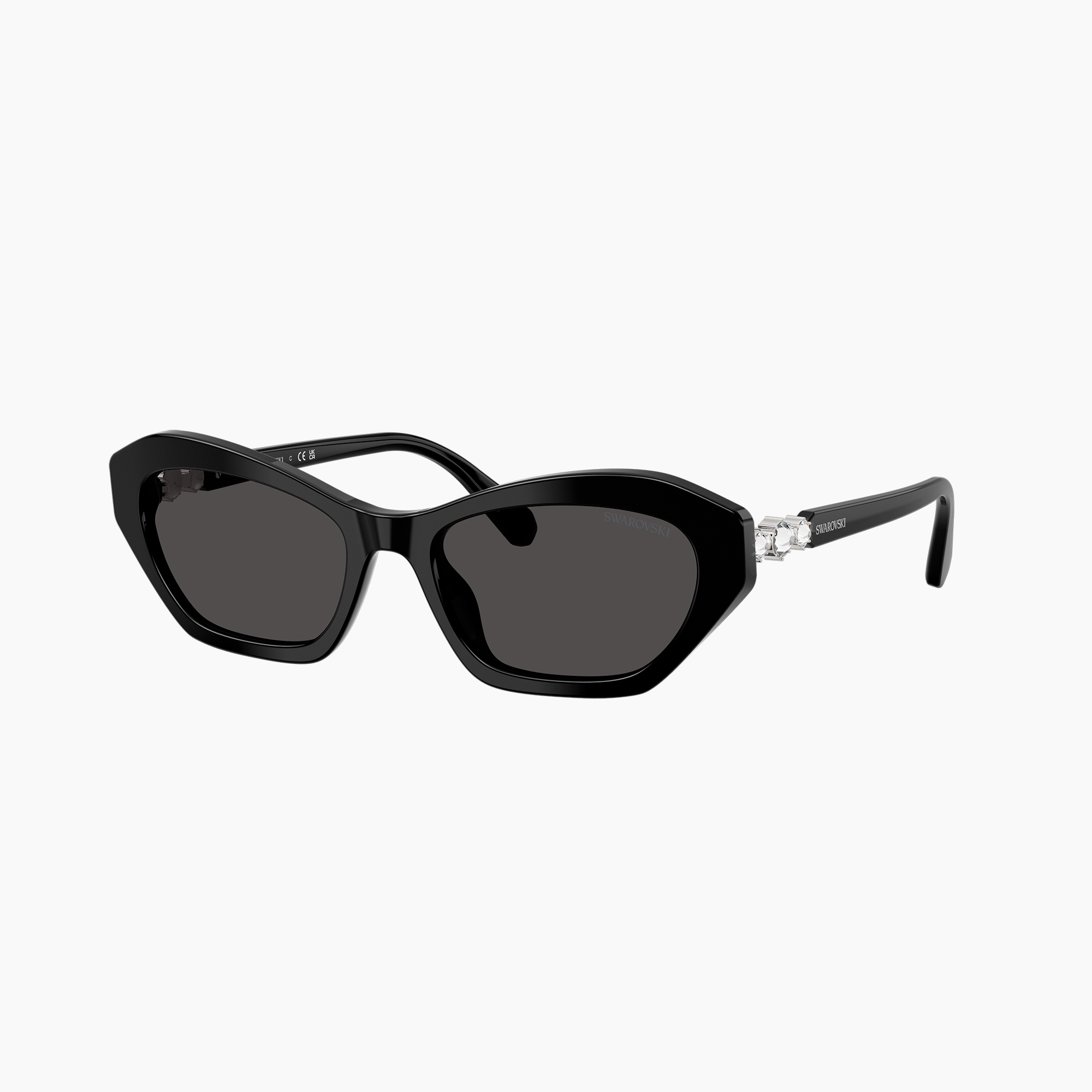 Montatura nera lucida, forma cat-eye femminile con lenti grigio scuro e dettagli in cristallo Swarovski sulle aste. Un accessorio elegante e sofisticato per chi ama uno stile distintivo e raffinato.