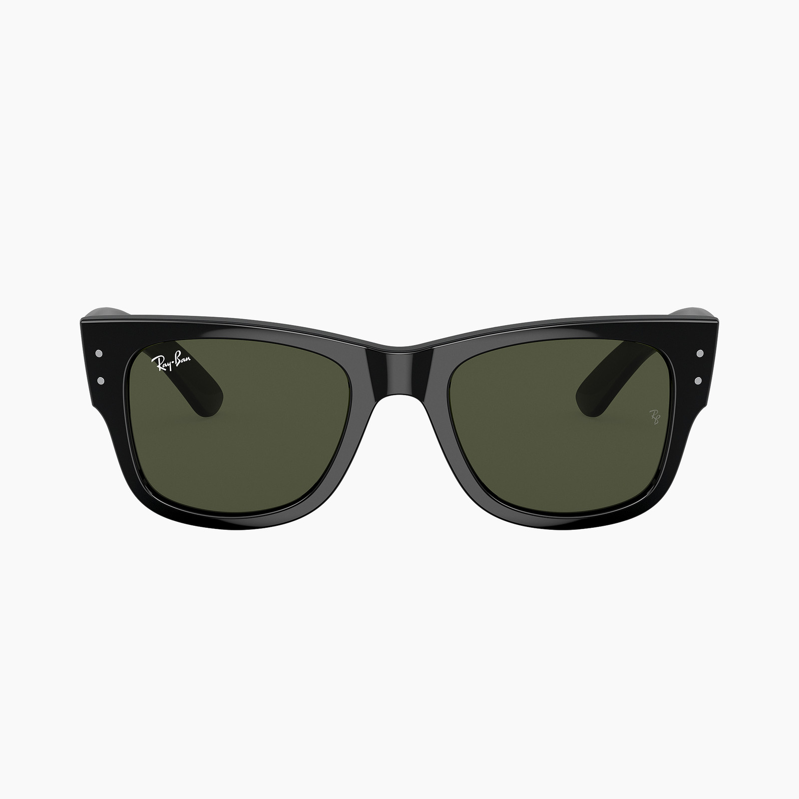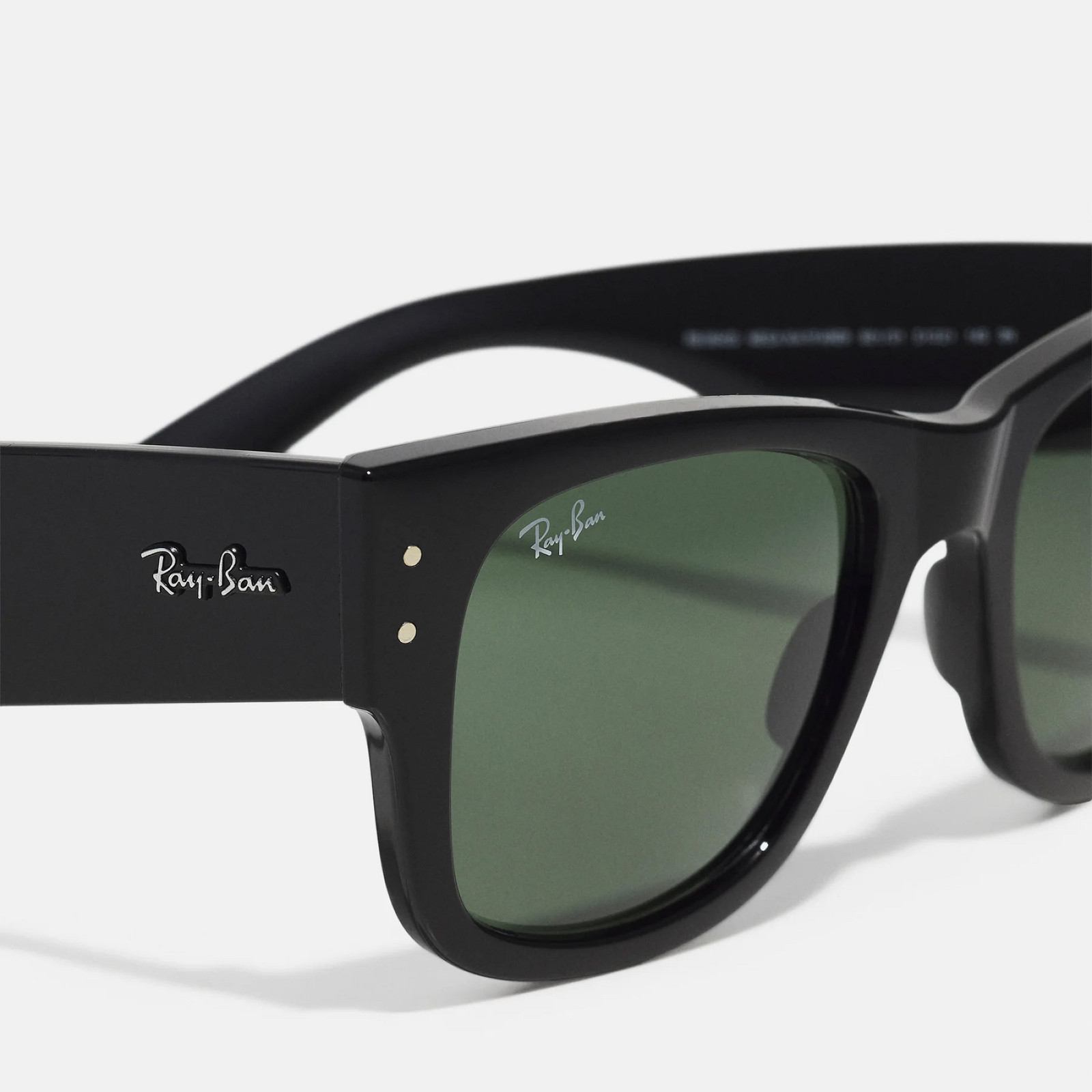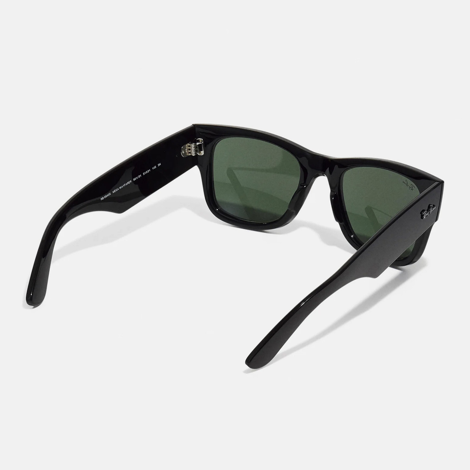 Gli occhiali da sole Ray-Ban Mega Wayfarer RB0840S in nero offrono una rivisitazione audace del classico design Wayfarer. La montatura squadrata in propionato nero lucido presenta aste spesse e doppie borchie argentate sul frontale, conferendo un aspetto distintivo. Le lenti verdi garantiscono una protezione UV ottimale, unendo stile e funzionalità. Questo modello è ideale per chi cerca un accessorio iconico con un tocco moderno.