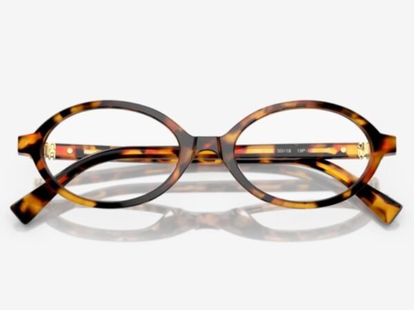 Gli occhiali da vista Miu Miu modello 0MU 01XV nella variante 19P101 presentano una montatura ovale in acetato color Havana chiaro. Le dimensioni principali includono una larghezza delle lenti di 50 mm, un ponte di 18 mm e aste di 140 mm.