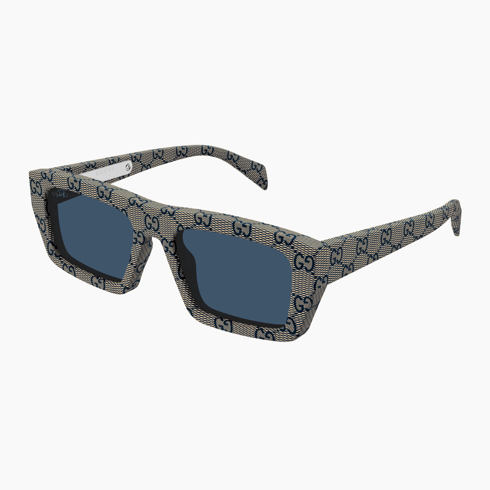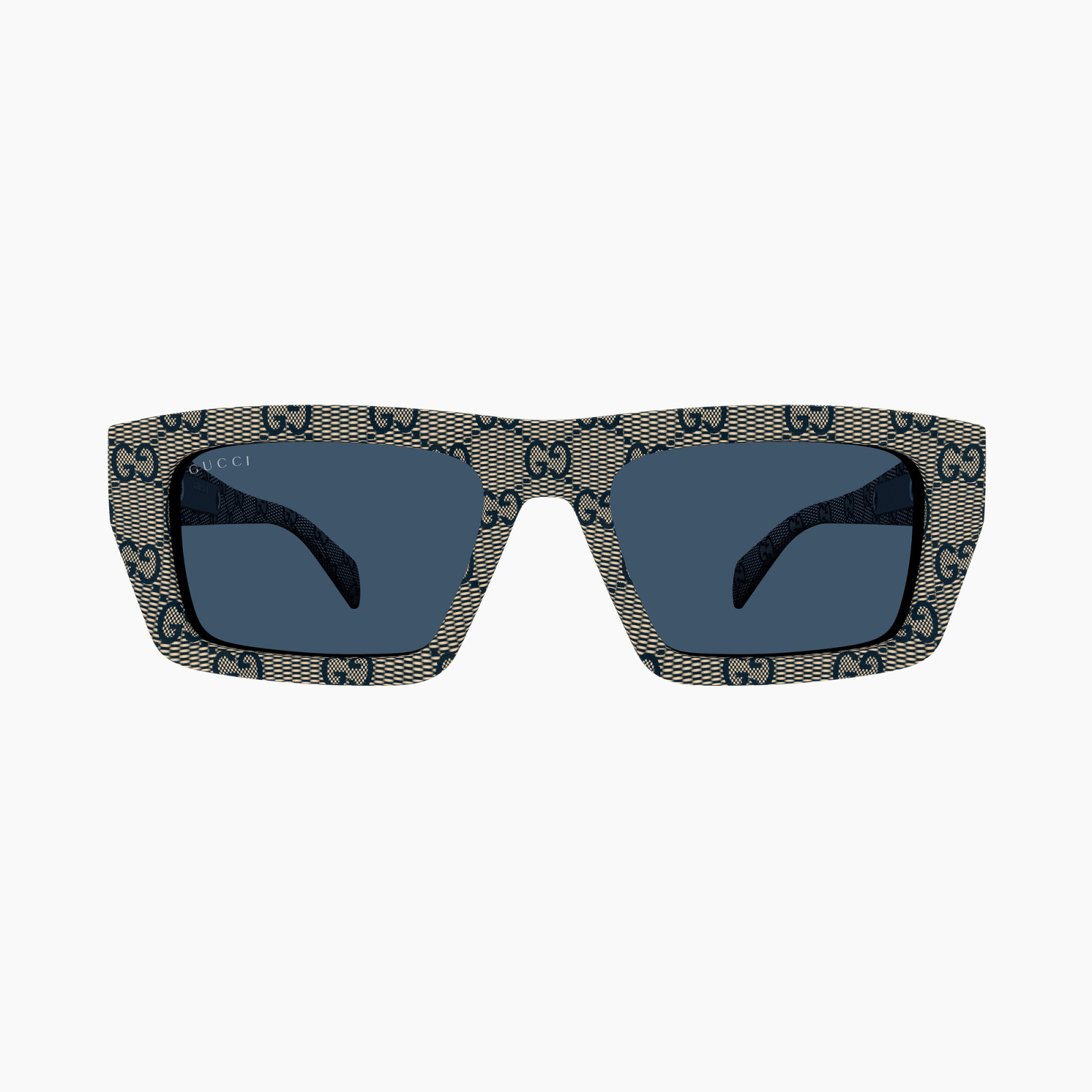 Montatura in acetato effetto canvas monogram GG beige/blu con lenti grigio-blu in bio-nylon, forma rettangolare oversize full-rim.