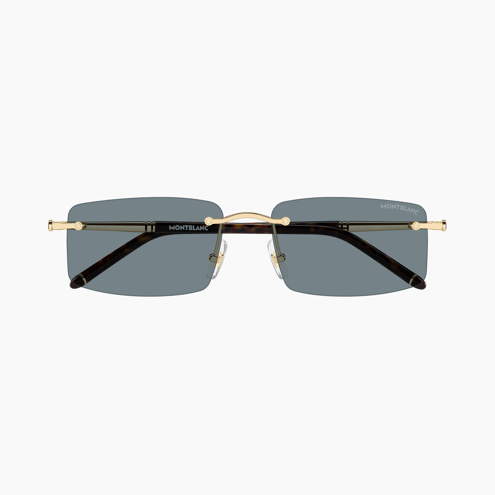 Occhiali da sole Montblanc con montatura metallo oro chiaro lucido e lenti grigio scuro tinta unita. Il design elegante e minimalista, ispirato alla linea Meisterstück, unisce lo stile raffinato Montblanc con comfort visivo e protezione solare completa.