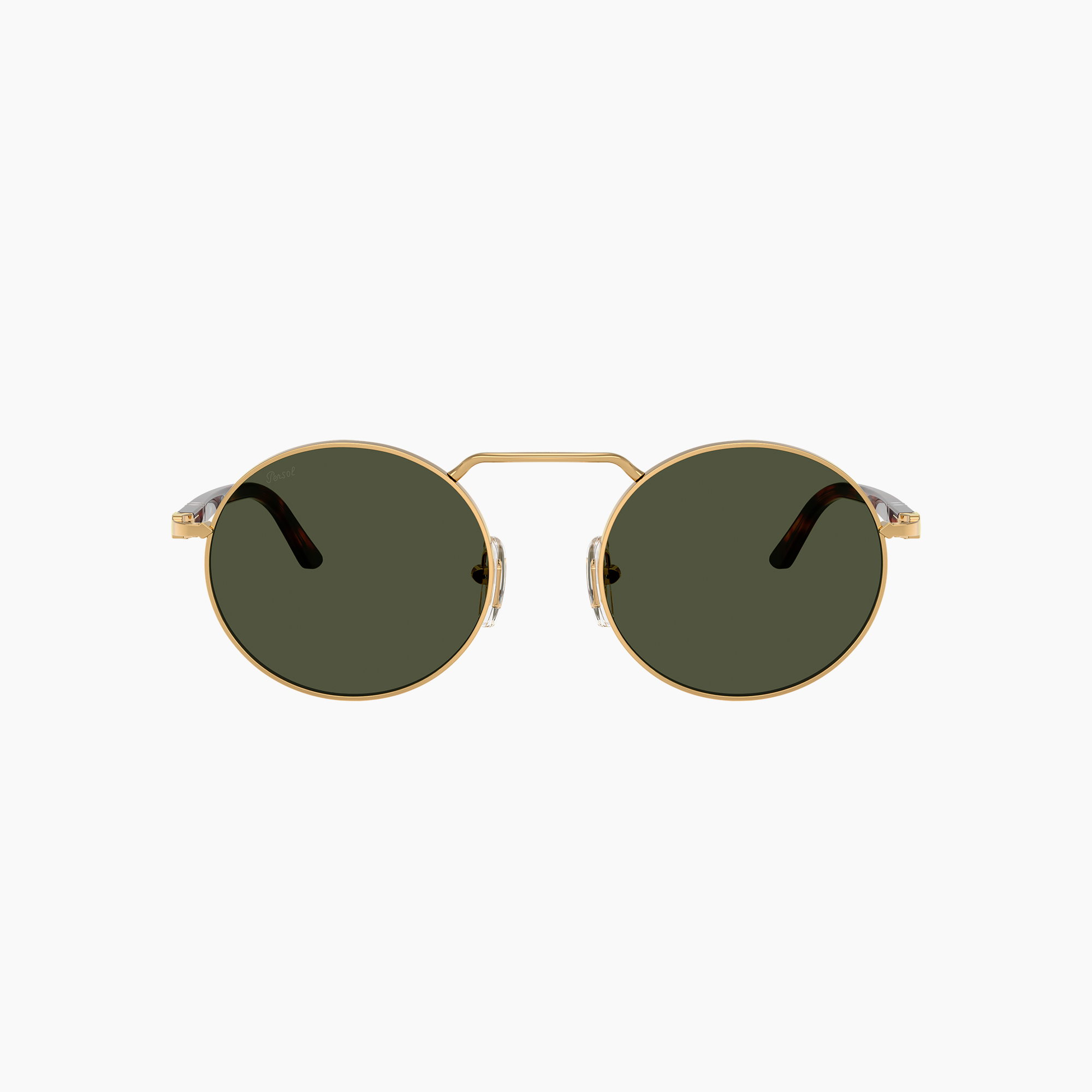 montatura in metallo oro, lenti verdi cristallo, formato 53-20-140 mm. Un modello iconico della casa Persol con naselli regolabili per adattarsi al viso. Perfetto per uno stile raffinato e di qualità artigianale italiana.