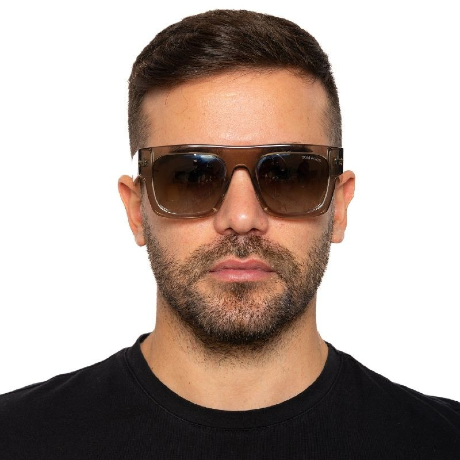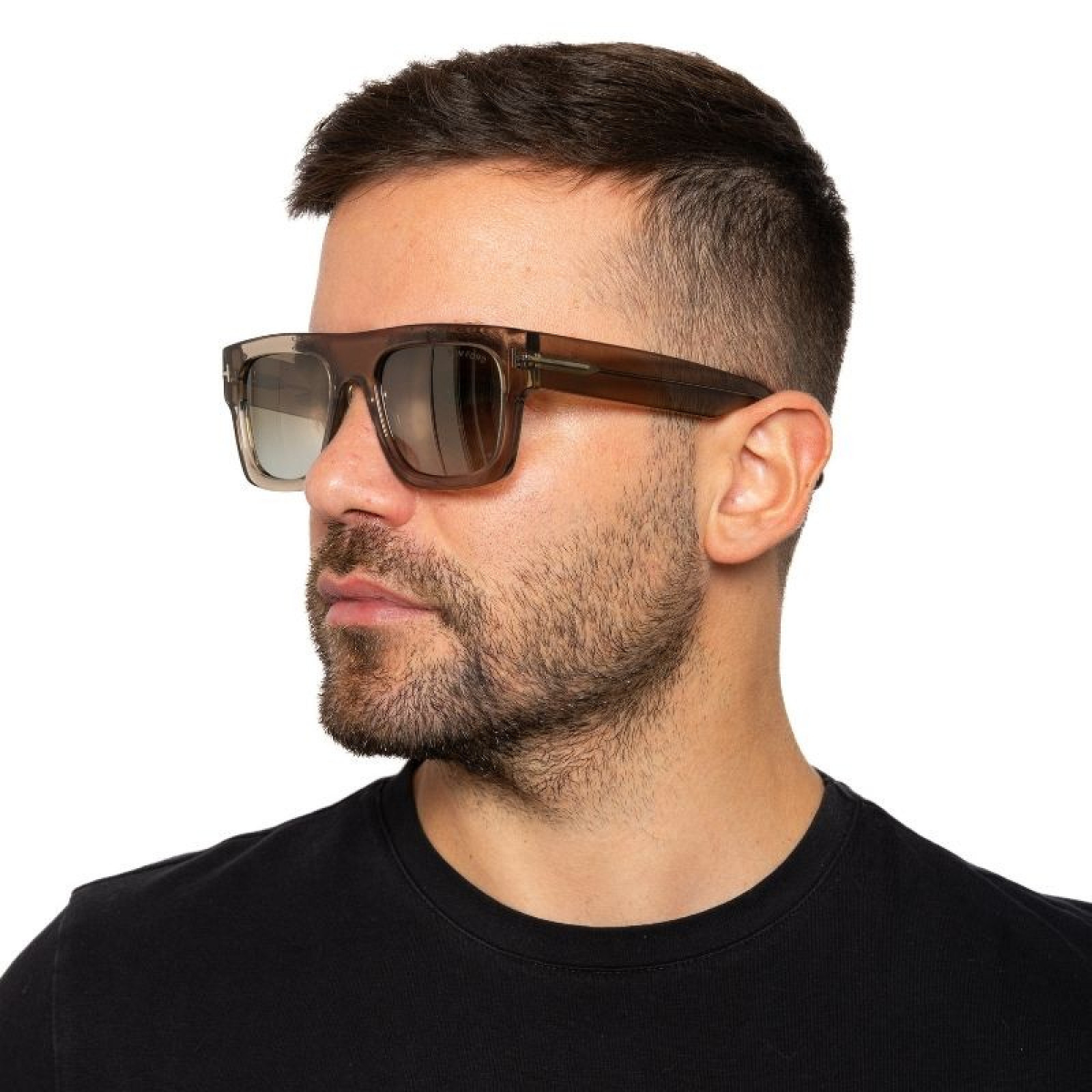 Gli occhiali da sole TOM FORD FT0711-47Q, noti anche come modello Fausto, presentano una montatura rettangolare in acetato trasparente marrone chiaro con aste marroni e lenti marroni sfumate con riflesso dorato pallido. Offrono una protezione UV al 100% e sono realizzati in Italia. Le dimensioni includono una larghezza delle lenti di 53 mm, un ponte di 20 mm e aste di 145 mm. Questi occhiali uniscono eleganza e funzionalità, completando qualsiasi look con stile.