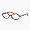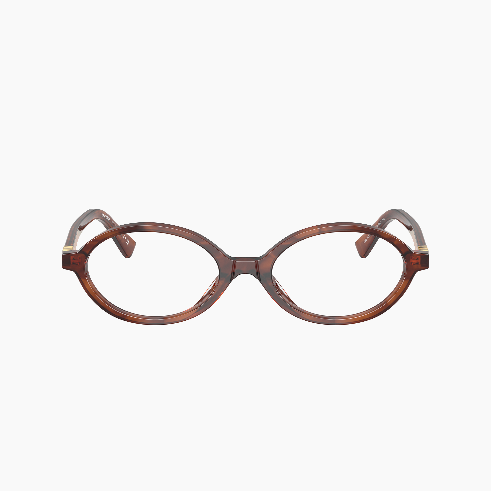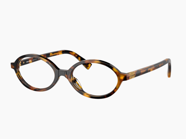Gli occhiali da vista Miu Miu modello 0MU 01XV nella variante 26E1O1 presentano una montatura ovale in acetato color Havana chiaro. Le dimensioni principali includono una larghezza delle lenti di 50 mm, un ponte di 18 mm e aste di 140 mm.